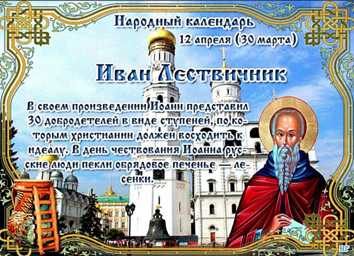 Дата в 2022 году: 12 апреля , вторник Другие названия: Иоанн Лествичник; беды с домовым Церковное название: Преподобного Иоанна Лествичника, игумена Синайского Значение: Почтение памяти святого игумена Иоанна Лествичника, Синайского Традиции: Выпечка небольших хлебцов в виде лесенки; закрывают домашних животных и не выходят во двор, чтобы домовой не причинил вред Народный праздник Иван Лествичник отмечается 12 апреля 2022 года (по старому стилю – 30 марта). В церковном календаре это дата почтения памяти святого игумена Иоанна Лествичника, Синайского. История Святой Иоанн жил предположительно во второй половине VI столетия. В 16 лет он пришел в Синайскую обитель и стал учеником Мартирия. Спустя четыре года принял монашеский постриг. Во время церемонии один из присутствующих, монах Стратигий, предрек, что молодой инок станет великим светильником христианской Церкви. 19 лет Иоанн жил в монастыре рядом со своим учителем и духовным руководителем Мартирием. Когда тот умер, монах ушел в пустыню Флу и стал отшельником. Там прошли сорок лет его жизни, которую Иоанн вел в молитвах, безмолвии и с соблюдением поста. В 75 лет Иоанн стал игуменом Синайского монастыря. Однажды настоятель Раифского монастыря попросил его написать руководство для восхождения к духовным вершинам. Так появился великий труд Иоанна – «Лествица», что на старославянском означает «лестница». Через четыре года на посту игумена святой мирно скончался. Традиции и обряды На Ивана Лествичника выпекают небольшие хлебцы в виде лесенки. Количество ступенек в ней должно равняться членам семьи. Каждый должен съесть это печенье – тогда здоровья хватит на целый год. По поверью, в этот день домовой безобразничает. Объясняют это тем, что он меняет старую шкуру, или у него свадьба с ведьмой. В общем домовой – хороший хозяин. В остальное время он помогает по хозяйству, предупреждает о беде или скорой смерти. Но характер у него своенравный. 12 апреля лучше не показываться ему на глаза. Можно попытаться его задобрить, но полностью домовой не успокоится до следующего утра. Чтобы избежать неприятностей, принято закрывать домашнюю живность и самим не выходить во двор. Приметы Если на Ивана Лествичника зацвел одуванчик, значит, лето быстро закончится. На березе уже есть листва, а на ольхе еще нет – нужно готовиться к засушливому лету. Зацвела черешня – настал срок сеять кукурузу и свеклу. Если лошадь пьет много воды – скоро пойдет дождь, а если почти не прикасается, то ближайшие дни будут ясными. Если птичьи гнезда больше расположены на южной стороне, то лето будет холодным. Дикие гуси летят высоко, значит, весна и лето будут дождливыми. Пчелы после зимы начинают вылетать из улья, значит, в ближайшие дни будет хорошая погода. | |