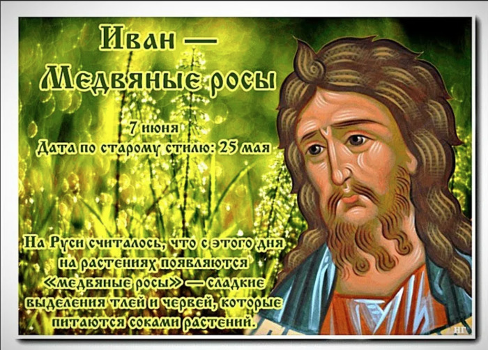 ТЕЛЕГРАММ замедляется.Вероятно скоро его заблокируют.Чтобы не потерять нас и получать оперативно информаци. подпишись на наши каналы в МАХ.Кто еще не подписался В полностью Российской сети МАХ на каналы ВОЕННЫЕ ПЕНСИОНЕРЫ ЗА РОССИЮ И ЕЕ ВООРУЖЕННЫЕ СИЛЫ: Канал для Военных пенсионерах без войны и политики, Военных пенсиях,пенсиях жен военных пенсионеров ,жизни военных пенсионеров и о способах прожить дольше : https://max.ru/voennyepen За Родину .Мы победим.: Оперативная информация О Спецоперации ,политике на канале: https://max.ru/join/aXh9SdoNhgk2rhy901ENolzCyoGLJhMgpon7E6np9n0 СРОЧНО ПОДПИСЫВАЙСЯ и ты будешь в курсе оперативных событий.НЕ пропусти!!! Дата в 2022 году: 7 июня , вторник Другие названия: Иванов день; Иван-гусятник; Иван головастый; гусятник; завистник птиц; медвяный день; Иоанн Предтеча Церковное название: третье обретение главы Пророка, Предтечи и Крестителя Господня Иоанна Значение: в честь третьего обретения главы Иоанна Крестителя Традиции: посев яровой пшеницы; молитвы Иоанну Предтече с просьбой защитить от медвяной росы Народный праздник Иван – Медвяные росы отмечается 7 июня 2022 года (дата по старому стилю – 25 мая). Православная Церковь этого числа вспоминает третье обретение главы Пророка, Предтечи и Крестителя Господня Иоанна. Название «Медвяные росы» праздник получил за то, что нередко утренние осадки в этот день бывают сладкими, с медовым привкусом. История Третье обретение головы святого Иоанна произошло в 850 году в Команах. В начале IX века его нетленные мощи христианам пришлось спрятать от иконоборцев, которые не остановились бы и перед уничтожением святой реликвии. Во время одной из ночных молитв патриарху Константинопольскому было даровано видение, в котором указывалось место тайного укрытия святых мощей в городе Команы. В то время у власти был император Михаил. Но империей управляла его мать Феодора, христианка, которой удалось подавить иконоборческие бунты и восстановить иконопочитание. По ее приказу в Команы отправилась делегация, которая вскоре вернулась с бесценной находкой. В какой именно день были найдены святые останки, неизвестно. Но в источниках сохранились данные о том, что именно 25 мая (по григорианскому календарю – 7 июня) их доставили в придворную церковь. Креститель Иоанн – второй по почитаемости православный святой после Девы Марии. В его честь установлено семь ежегодных праздников. Традиции и обряды С этого дня начинается поздняя посевная ярового хлеба. В этот народный праздник люди обращаются к святому Иоанну Предтече с просьбой оградить поля и огороды от медвяной росы. Ее появление с давних пор считается напастью. С ней связывают падеж скота. Она губит колосья ржи, листья тыквы, огурца и винограда. Если медвяная или мучнистая роса все же нападает, это считают Божьим наказанием. Бытует заблуждение, что медвяная и мучнистая росы – одно и то же, грибковое заболевание. На самом деле медвяная роса выделяется листьями растений вследствие внезапных скачков влажности и температуры за короткий период. Побороть ее нелегко, не помогают даже такие проверенные «помощники», как медный купорос, зола и молочная сыворотка. Мучнистая роса – результат выделений разных сокососущих насекомых-вредителей, к которым налипали чешуйки и шкурки линяющей тли. С этим видом росы справиться легче, проведя своевременную профилактическую обр