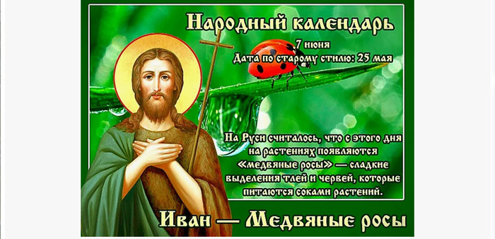 ТЕЛЕГРАММ замедляется.Вероятно скоро его заблокируют.Чтобы не потерять нас и получать оперативно информаци. подпишись на наши каналы в МАХ.Кто еще не подписался В полностью Российской сети МАХ на каналы ВОЕННЫЕ ПЕНСИОНЕРЫ ЗА РОССИЮ И ЕЕ ВООРУЖЕННЫЕ СИЛЫ: Канал для Военных пенсионерах без войны и политики, Военных пенсиях,пенсиях жен военных пенсионеров ,жизни военных пенсионеров и о способах прожить дольше : https://max.ru/voennyepen За Родину .Мы победим.: Оперативная информация О Спецоперации ,политике на канале: https://max.ru/join/aXh9SdoNhgk2rhy901ENolzCyoGLJhMgpon7E6np9n0 СРОЧНО ПОДПИСЫВАЙСЯ и ты будешь в курсе оперативных событий.НЕ пропусти!!! В Телеграмм создана группа " Военные пенсионеры за Россию и ее ВС. Мы победим". У кого есть Телеграмм просим вступить в нее. Там много интересного, срочного, очень оперативная информация, а также чего нельзя помещать в ОДНОКЛАССНИКАХ и на сайте. Вступить можно по ссылке: Военные пенсионеры за Россию и ее ВС. Мы победим "https://t.me/voenpenszaRossiu" Очень большая просьба НЕ ОТПИСЫВАТЬСЯ ОТ КАНАЛА, Канал работает в тестовом режиме. Мы стараемся понять, что Вам будет интересно читать и как работать дальше. Пишите, что бы Вам хотелось читать в ТЕЛЕГРАММ. Хоть в любой теме на сайте, хоть в Телеграмм. Чтобы не раздражали уведомления их можно ОТКЛЮЧИТЬ. Кого раздражают уведомления в Телеграмм их можно отключить. Отключить уведомления можно нажав на надпись ОТКЛЮЧИТЬ УВЕДОМЛЕНИЯ внизу Дата в 2025 году: 7 июня , суббота Другие названия: Иванов день; Иван-гусятник; Иван головастый; гусятник; завистник птиц; медвяный день; Иоанн Предтеча Церковное название: третье обретение главы Пророка, Предтечи и Крестителя Господня Иоанна Значение: в честь третьего обретения главы Иоанна Крестителя Традиции: посев яровой пшеницы; молитвы Иоанну Предтече с просьбой защитить от медвяной росы Народный праздник Иван – Медвяные росы отмечается 7 июня 2025 года (дата по старому стилю – 25 мая). Православная Церковь этого числа вспоминает третье обретение главы Пророка, Предтечи и Крестителя Господня Иоанна. Название «Медвяные росы» праздник получил за то, что нередко утренние осадки в этот день бывают сладкими, с медовым привкусом. История Третье обретение головы святого Иоанна произошло в 850 году в Команах. В начале IX века его нетленные мощи христианам пришлось спрятать от иконоборцев, которые не остановились бы и перед уничтожением святой реликвии. Во время одной из ночных молитв патриарху Константинопольскому было даровано видение, в котором указывалось место тайного укрытия святых мощей в городе Команы. В то время у власти был император Михаил. Но империей управляла его мать Феодора, христианка, которой удалось подавить иконоборческие бунты и восстановить иконопочитание. По ее приказу в Команы отправилась делегация, которая вскоре вернулась с бесценной находкой. В какой именно день были найдены святые останки, неизвестно. Но в источниках сохранились данные о том, что именно 25 мая (по григорианскому календарю – 7 июня) их доставили в придворную церковь. Креститель Иоанн – второй по почитаемости православный святой после Девы Марии. В его честь установлено семь ежегодных праздников. Традиции и обряды С этого дня начинается поздняя посевная ярового хлеба. В этот народный праздник люди обращаются к святому Иоанну Предтече с просьбой оградить поля и огороды от м
