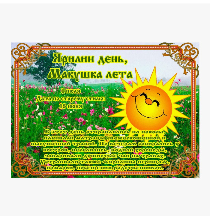 ТЕЛЕГРАММ замедляется.Вероятно скоро его заблокируют.Чтобы не потерять нас и получать оперативно информаци. подпишись на наши каналы в МАХ.Кто еще не подписался В полностью Российской сети МАХ на каналы ВОЕННЫЕ ПЕНСИОНЕРЫ ЗА РОССИЮ И ЕЕ ВООРУЖЕННЫЕ СИЛЫ: Канал для Военных пенсионерах без войны и политики, Военных пенсиях,пенсиях жен военных пенсионеров ,жизни военных пенсионеров и о способах прожить дольше : https://max.ru/voennyepen За Родину .Мы победим.: Оперативная информация О Спецоперации ,политике на канале: https://max.ru/join/aXh9SdoNhgk2rhy901ENolzCyoGLJhMgpon7E6np9n0 СРОЧНО ПОДПИСЫВАЙСЯ и ты будешь в курсе оперативных событий.НЕ пропусти!!! Дата в 2024 году: 1 июля , понедельник Другие названия: Ярилки; Ярилов день; Середина лета; сенозарница Значение: Посвящен славянскому богу солнца Яриле Традиции: Набивание матрацев свежескошенной высушенной травой; сбор трав для чая; купание в утренней росе; ярмарки; народные гуляния; обряд похорон Ярилы Народный праздник Ярилин день отмечается 1 июля 2024 года (дата по старому стилю – 18 июня). Он посвящен славянскому богу солнца. «Макушкой лета» народ назвал этот день потому, что он как раз приходится на самую жаркую пору сезона. История Праздник возник в те времена, когда на Руси еще не было христианства, и предки славянских народов почитали и просили помощи у небесных светил, природы и животных. Ярила (Ярило) – персонаж славянских древних легенд. Он считается божеством. Его связывают с солнцем, теплом, плодородием, мужской силой и войной. Легенды гласят, что в этот день остальные боги мерялись с Ярилой своей силой, но он неизменно выходил из схваток победителем. Хоть Православная Церковь и против подобных праздников, и называет это язычеством и идолопоклонством, Ярилин день не утратил былой популярности. Люди продолжают верить в силу солнца и отмечать макушку лета. Особенно этот праздник почитают восточные славяне. Традиции и обряды 1 июля – мистический день. Небесное светило приостанавливает свой ход по небосводу, чтобы основательно прогреть землю. На ней открываются «окна», через которые виден другой конец света, а иногда и другие, потусторонние миры. В Ярилин день можно увидеть человека, от которого давно нет известий. Для этого в волосы нужно вплести березовые прутья и посмотреть сквозь косу, стоя на высоком берегу реки в сторону другого берега. В этот народный праздник люди косят и сушат траву, а затем набивают ею матрацы. Собирают травы для заваривания душистого чая. Горячий напиток из целебных трав, которые собраны в Ярилин день, избавляет от многих недугов. Купаются в утренней росе. Она в этот день наделена волшебством. Дарит людям красоту, силу или здоровье, в чем они больше остального нуждаются. Выгоняют и скот на пастбища, чтобы он походил в Ярилиной росе. Легонько бьют детей и домашних животных вербовыми прутиками. При этом желают им здоровья и хорошего роста. Устраивают ярмарки, гуляния, хороводы и состязания, на которых молодежь показывает свою силу и ловкость. Проводят обряд похорон Ярилы: с наступлением темноты зажигают огни, выносят соломенное чучело в поле или бросают его в воду. Приметы Следующие за праздником семь дней будут жаркими. Утренний туман по низине стелется – ближайшие дни будут погожими. Месяц на небе такой, что на нижний рожок можно «повесить» ведро – к засушливым дням. Ветер винтом – к погож
