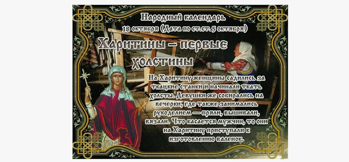 ТЕЛЕГРАММ замедляется.Вероятно скоро его заблокируют.Чтобы не потерять нас и получать оперативно информаци. подпишись на наши каналы в МАХ.Кто еще не подписался В полностью Российской сети МАХ на каналы ВОЕННЫЕ ПЕНСИОНЕРЫ ЗА РОССИЮ И ЕЕ ВООРУЖЕННЫЕ СИЛЫ: Канал для Военных пенсионерах без войны и политики, Военных пенсиях,пенсиях жен военных пенсионеров ,жизни военных пенсионеров и о способах прожить дольше : https://max.ru/voennyepen За Родину .Мы победим.: Оперативная информация О Спецоперации ,политике на канале: https://max.ru/join/aXh9SdoNhgk2rhy901ENolzCyoGLJhMgpon7E6np9n0 СРОЧНО ПОДПИСЫВАЙСЯ и ты будешь в курсе оперативных событий.НЕ пропусти!!! Дата в 2024 году: 18 октября , пятница Другие названия: Харитина, день Харитины, Харитинин день, Вековечная ткачиха, Аритина – вечная ткачиха Церковное название: Мученицы Харитины Амисийской (Понтийской) Значение: Почтение памяти святой Харитины Традиции: Ткут холсты; устраивают девичьи посиделки (занимаются шитьем, вышивкой, вязанием); мужчины работают над изготовлением валенок; спускаются с горы на прялках 18 октября 2024 года (дата по старому стилю – 5 октября) христиане почитают святую мученицу Харитину. В этот день девушки и женщины начинают ткать холсты, поэтому в народе данный праздник и назвали Харитины – первые холстины. Сиротка Харитина была взята на воспитание неким Клавдием Птолемеем из города Понте. Вскоре она приняла христианство. Клавдий выстроил для нее дом, где девушка поселилась и стала вести целомудренный образ жизни. Однажды Харитина была оклеветана язычниками и, защищаясь в суде, подверглась множеству пыток и истязаний: ей посыпали голову раскаленными углями, обливали кислотой, ломали кости. Но несмотря на это, девушка не отреклась от своей веры, а продолжала стойко молиться. Тогда, привязав к ее телу камень, палачи бросили Харитину в море. Высшие силы спасли ее, и она вышла из морской пучины. Решив показать, что на все воля Господа Бога, она явилась к городничему. Однако он объявил ее колдуньей и велел слугам надругаться над ней. Оказавшись в окружении мужчин, она вскинула руки к небу, и Господь принял ее душу, а бездыханное тело осталось на земле. Городничий распорядился избавиться от тела, но через три дня оно прибилось к берегу, где было обнаружено ее воспитателем Клавдием. Он забрал его и предал земле. Традиции и обряды В этот день девушки начинают вечерки – посиделки, во время которых занимаются шитьем, вязанием, вышивкой, а мужчины изготавливают валенки. Первую нитку, которая получается в результате пряжи шерсти, одевают детям на левую руку. Считается, что она обладает определенной силой от сглаза. Сила такая великая, что эту нить не надо заговаривать. Женская половина начинает съезжать на прялках с горы. Согласно поверью, длина пути показывает высоту льна, который вскоре уродится. Однако если женщина падает с прялки, то это сулит несчастье – она умрет до следующей осени. Считается, что если кудель начата, то ее нельзя оставлять на ночь, а тем более без специального заговора. Если не провести обряд, то в доме поселится нечистая сила. Приметы Если в этот день кружатся птицы, а облака идут не по ветру, то скоро выпадет снег. Если на Харитину нет ветра, значит, быть холодной погоде. Если туман исчезнет после восхода солнца или слышен треск деревьев, то погода будет хорошей. Если на березе остались листья или п