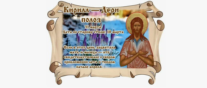 Дата в 2026 году: 31 марта , вторник Другие названия: День Кирилла; Кириллов день; Кирилл – полозья дери Церковное название: Святителя Кирилла, архиепископа Иерусалимского Значение: Почтение памяти святого Кирилла Иерусалимского Традиции: Молитвы о дождях; лечение грыжи; заговоры от бед Народный праздник Кирилл – дери полоз отмечается 31 марта 2026 года (по старому стилю – 18 марта). В православном церковном календаре это дата почтения памяти святителя Кирилла Иерусалимского, архиепископа. Название «дери полоз» праздник получил потому, что в старые времена тот, кто решался выехать на санях в этот день, мог легко испортить полозья на подмерзшей за ночь дороге. История Кирилл родился в Иерусалиме в 315 году. Его семья вела благочестивый и строго христианский образ жизни. В совершеннолетнем возрасте Кирилл принял монашеский постриг. Через несколько лет (в 346 году) его назначили пресвитером. Спустя четыре года он стал приемником усопшего архиепископа Максима. Кирилл яростно боролся против ереси арианского учения. Этим он возбудил против себя ненависть епископов, которые поддерживали данный вид христианства. Они добились отстранения его от должности и изгнания из города. В тяжелые для города времена, когда повсюду царил голод, Кирилл распродал все свое имущество, чтобы купить нуждающимся еды. Когда деньги закончились, он начал продавать церковные принадлежности. На вырученные средства покупал пшеницу. Еретики и эти поступки извратили и вменили в вину святителю при изгнании из города. Кирилла приютил епископ Сильван из Тарсы. Но вскоре и здесь его оболгали. Император приказал арестовать Кирилла. Когда к власти пришел Юлиан-отступник, его выпустили на свободу. Но к своим прежним обязанностям Кирилл смог приступить только после смерти Юлиана. С приходом на трон Валента его снова изгнали почти на 10 лет. И лишь царь Феодосий Великий вернул святителя в город и восстановил в архипастырской деятельности. Кирилл оставил после себя много трудов, лучшими из которых признаны 23 поучения и две беседы на евангельскую тему. Традиции и обряды Особых традиций празднования нет. В этот день принято в молитвах просить о дождях для роста посевов. Целители лечат грыжу. Знахари читают заговоры от несчастий. Приметы и поверья Если зацвела мать-и-мачеха – апрель будет теплым, а лето наступит быстро. Прилетели лебеди – быть теплу. Если не видно скворцов, значит, скоро начнется ненастье. Появились комары – ближайшие дни будут теплыми. Нельзя стричь волосы и ногти – можно неприятности накликать. Нежелательно ходить в гости. По народному поверью, там можно оставить свою удачу. Также нельзя открывать дверь посторонним и тем более впускать их в дом, если в это время купается маленький ребенок. Иначе малыш может лишиться счастливой доли. | |