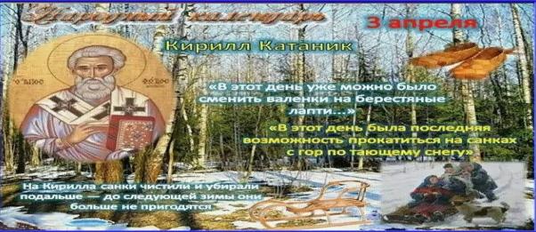 Дата в 2026 году: 3 апреля , пятница Другие названия: Качальник; День Качальника; День Кирилла Качальника; День Кирилла Катаника; Колодезница Церковное название: Святителя Кирилла Катанского (Сицилийского), епископа Значение: Почтение памяти святого Кирилла Катанского Традиции: Катание на санках; умывание колодезной водой Народный праздник Кирилл Катаник отмечается 3 апреля 2026 года (по старому стилю – 21 марта). В церковном православном календаре это дата почтения памяти святителя Кирилла Катанского (Сицилийского), епископа. День прозван «Катаником» потому, что «закрывает» зимний сезон. В старину этот праздник называли «Колодезницей». Согласно народному поверью, колодезная вода 3 апреля благословенна самой Царицей Небесной Девой Марией. История Кирилл жил в I-II столетиях. Был родом из сирийского города Антиохии (современная Турция). Ему посчастливилось стать учеником апостола Петра, который впоследствии назначил его епископом в сицилийском городе Катане. Господь наградил Кирилла даром чудотворения за благочестивость, мудрое управление паствой и всевозможную помощь своим прихожанам. В одном источнике вода имела горький привкус. Ее невозможно было пить. После того как епископ Кирилл прочел над ним молитву, она потеряла горечь и стала пригодной для употребления. Благодаря этому случаю многие идолопоклонники приняли христианство и уверовали в Господа. Епископ Кирилл Катанский прожил долгую богоугодную жизнь. В мир иной он отошел в глубокой старости. Похоронили его в Сицилии. Традиции и обряды В этот день можно последний раз насладиться катанием на санках. Считается, что в последующие дни снег уже не так хорош для этой забавы, и детворе лучше переключиться на весенние игры. После этого праздника санки чистят и убирают до следующей зимы. Детям говорят, что плакать бесполезно, потому что Катаник санки забрал. 3 апреля убирают зимнюю обувь и достают весеннюю. В этот день колодезная вода обладает волшебной силой, такой же, как на праздник Крещения. Поэтому ею умываются, чтобы защитить себя от болезней, сглаза, порчи и от врагов. Приметы и поверья Если грянет гром, значит, год выдастся очень урожайным. Облака окрашены в синий цвет – жди теплой, но дождливой погоды. Если в этот день береза дает много сока, значит, летний сезон будет изобиловать дождями. Появились комары – к скорому потеплению. Если роды выпадают на Кирилла Катаника, то роженице не стоит переживать – они пройдут успешно. Если окропить колодезной водой земельный надел, то он даст богатый урожай. Если у человека материальные трудности, и он хочет стать богатым, то ему нужно посмотреть в колодец и трижды прокричать: Встань со дна, богатая судьба, Сколько на твоем дне есть камешков и песка, Столько бы у меня было денег и добра. | |