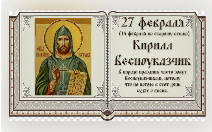 ТЕЛЕГРАММ замедляется.Вероятно скоро его заблокируют.Чтобы не потерять нас и получать оперативно информаци. подпишись на наши каналы в МАХ.Кто еще не подписался В полностью Российской сети МАХ на каналы ВОЕННЫЕ ПЕНСИОНЕРЫ ЗА РОССИЮ И ЕЕ ВООРУЖЕННЫЕ СИЛЫ: Канал для Военных пенсионерах без войны и политики, Военных пенсиях,пенсиях жен военных пенсионеров ,жизни военных пенсионеров и о способах прожить дольше : https://max.ru/voennyepen За Родину .Мы победим.: Оперативная информация О Спецоперации ,политике на канале: https://max.ru/join/aXh9SdoNhgk2rhy901ENolzCyoGLJhMgpon7E6np9n0 СРОЧНО ПОДПИСЫВАЙСЯ и ты будешь в курсе оперативных событий.НЕ пропусти!!! Дата в 2024 году: 27 февраля , вторник Другие названия: Кирилл указчик; Кирилл; Весноуказник; Бабьи Взбрыксы Церковное название: Равноапостольного Кирилла, учителя Словенского Значение: Почтение памяти святого Кирилла, создателя первой славянской азбуки Традиции: Утаптывание снега; приготовление сбитня – горячего сладкого напитка Народный праздник Кирилл Весноуказчик отмечается 27 февраля 2024 года (по старому стилю – 14 февраля). В православном календаре это дата почтения памяти святого равноапостольного Кирилла (Константина), учителя Словенского. В народе его прозвали Весноуказчиком, так как по погоде этого дня судили о весне. История Святой Кирилл (мирское имя – Константин) и его брат Мефодий – равноапостольные первоучители и просветители. Они были родом из Македонии, города Солуни. С 14 лет Кирилл воспитывался с императорским сыном. За свой ум и выдающиеся познания получил прозвище Философ (Мудрый). В юношестве принял сан пресвитера и отправился в Константинополь в соборную церковь, как библиотекарь и философ. Вскоре ушел к Мефодию на гору Олимп, чтобы обрести там покой и уединение. Пробыл в том месте недолго. В 857 году император Михаил направил обоих братьев в миссионерское путешествие к хазарам проповедовать христианскую веру (их путь лежал через Херсонес, где святые обрели мощи мученика Климента, Римского Папы). Благодаря трудам братьев хазарский князь и его народ приняли христианство. Правитель отпустил всех греческих пленников, и вместе с ними святой Кирилл вернулся в Константинополь. В 862 году император отправил святых в Мордовию проповедовать христианство на славянском языке. Вместе с братом святой Кирилл перевел множество книг с греческого на славянский, обучил людей чтению и письму, стал создателем первой славянской азбуки. По приглашению Папы Римского Адриана святые Кирилл и Мефодий отправились в Рим. Их встретили с большим уважением, так как братья принесли с собой мощи священномученика Климента, Римского Папы. В 869 году, в 42 года, святой Кирилл скончался. Похоронили его в церкви святого Климента. Традиции и обряды В старину, для того чтобы земля впитала больше влаги, мужчины в этот день выходили в поле и специально утаптывали снег. По завершении работ дома их ждал сбитень – традиционный славянский горячий сладкий напиток. Предки почитали его за целебные свойства. В его состав входили мед или патока и разные пряности. У каждой хозяйки был свой рецепт приготовления сбитня. Многие и сегодня утрамбовывают снег и пьют в мороз сбитень. В некоторых регионах, помимо утаптывания снега, вывозят на поля навоз. Во времена существования повивальных бабок (сейчас эта профессия называется акушер) на Кирилла Весноука