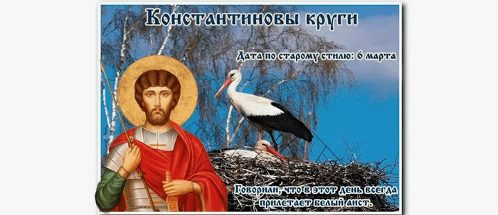 Дата в 2026 году: 19 марта , четверг Другие названия: Константин; Константинов день; День кругов вокруг колодца Церковное название: Мучеников 42-х во Амморее: Константина, Аетия, Феофила, Феодора, Мелиссена, Каллиста, Васоя и прочих с ними Значение: Почтение памяти 42-х мучеников из города Амморея – Константина и других Традиции: Обряд вытаптывания снега вокруг колодца; освящение колодцев; поход в баню; поминание усопших; запрещено ругаться, сквернословить, пьянствовать и сплетничать Народный праздник Константиновы круги отмечается 19 марта 2016 года (по старому стилю – 6 марта). В православном церковном календаре это дата почтения памяти 42-х мучеников из города Амморея – Константина и прочих. Название «Круги» праздник получил в честь обряда вытаптывания снега вокруг колодца. История Святой Константин жил в IX столетии. Был воином. Он оставил священный сан ради защиты родного города Аммореи от сарацинов. Вместе с 41 защитником Константина схватили и доставили в Сирию. Семь лет мусульмане пытались заставить христианских воинов отречься от православия и принять ислам, но первыми сдались в этой духовной схватке. Чтобы поражение не выглядело столь жалким, всех христиан (Константина в том числе) казнили. Их тела сбросили в реку Евфрат. Традиции и обряды 19 марта проводится специальный обряд вытаптывания снега вокруг колодца. Делается это для того, чтобы грязный талый снег не проник в воду, и она оставалась чистой и вкусной. Считается, что так колодезная вода может одарить крепостью духа и здоровьем. Первым для этого дела призывается мальчик или подросток с именем Константин. Также в этот день святят колодцы и ходят в баню. Таким образом люди выражают свое почтение воде. Другой ритуал, который проводится 19 марта, связан с поминанием усопших. Во время ужина еда специально не доедается. Ее остатки высыпаются в колодец. Так живые передают гостинец умершим родственникам и друзьям. По народному поверью, из колодца на людей смотрят их предки. Поэтому у него нужно вести себя достойно во все дни. Запрещено в этот день ругаться, сквернословить, пьянствовать и сплетничать. Беременным и женщинам, у которых на праздник припадает менструация, нельзя приближаться к колодцу. Считается, что это оскверняет воду. На Константиновы круги возвращаются домой белые аисты. Их прилета очень ждут. Ведь эти птицы символизируют начало новой жизни, удачу, возрождение. Приметы Морозный день – жди скорой весны и теплого сухого лета. Утренние заморозки означают подобную погоду еще на месяц. Если застучал дятел – это к долгим холодам. Плевать в колодец – что в глаза родной матушке. 19 марта нельзя пить из чужого колодца. | |