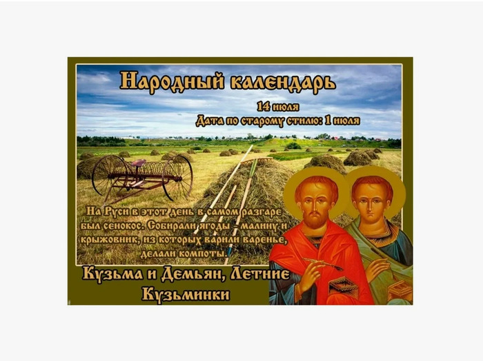 ТЕЛЕГРАММ замедляется.Вероятно скоро его заблокируют.Чтобы не потерять нас и получать оперативно информаци. подпишись на наши каналы в МАХ.Кто еще не подписался В полностью Российской сети МАХ на каналы ВОЕННЫЕ ПЕНСИОНЕРЫ ЗА РОССИЮ И ЕЕ ВООРУЖЕННЫЕ СИЛЫ: Канал для Военных пенсионерах без войны и политики, Военных пенсиях,пенсиях жен военных пенсионеров ,жизни военных пенсионеров и о способах прожить дольше : https://max.ru/voennyepen За Родину .Мы победим.: Оперативная информация О Спецоперации ,политике на канале: https://max.ru/join/aXh9SdoNhgk2rhy901ENolzCyoGLJhMgpon7E6np9n0 СРОЧНО ПОДПИСЫВАЙСЯ и ты будешь в курсе оперативных событий.НЕ пропусти!!! Дата в 2024 году: 14 июля , воскресенье Другие названия: Кузьма и Демьян; День Козьмы и Демьяна; День Космы и Дамиана; летние кузьминки; бабий праздник; женский праздник; девичий праздник; бабьи посиделки; женские братчины Церковное название: Бессребреников мучеников Космы и Дамиана, в Риме пострадавших Значение: Почтение памяти мучеников-бессребреников Космы и Дамиана Римских Традиции: Молитвы святым Косме и Дамиану об избавлении от недугов; девичьи посиделки; прошение прощения Народный праздник Кузьминки летние отмечается 14 июля 2024 года (по старому стилю – 1 июля). В церковном календаре дата посвящается мученикам-бессребреникам Косме и Дамиану Римским. Праздник получил название «Кузьминки» в честь одного из святых, которых почитают в этот день – Космы. Поскольку это необычное имя для славян, они подобрали похожее. История Святые Косма и Дамиан жили в Риме в III–IV веках. Они были родными братьями. Мать воспитала их в христианском милосердии. Они посвятили себя врачеванию. Причем за лечение никогда не брали денег, а просили своих пациентов уверовать в Господа и прийти к Нему. Когда слава о них дошла до императора, тот приказал привести их и судить как чародеев. Но по воле Всевышнего правителю на процессе так свело шею, что он смог пошевелить ею только после того, как признал братьев невиновными и отпустил. Погибли они от руки своего же наставника-врача. Он в приступе зависти к их почету и всеобщей любви заманил святых на скалы и убил, а тела сбросил в реку. Традиции и обряды В этот народный праздник люди молятся Косме и Дамиану об избавлении от болезней. Святые братья с давних пор считаются покровителями лекарей. Поэтому все, кто связан с медициной, ставят им свечи и просят силы, знаний и защиты. Народные целители в этот день лечат неврозы и заговаривают навязчивые мысли. Кузьминки летние – женский праздник. Проведя день в хлопотах по дому и огороду, вечером девушки собираются на посиделки. По традиции они готовят сборную кашу, для которой каждая приносит то, что может. Разнообразить стол разрешается только овощами или фруктами. Животная пища не должна на нем присутствовать. Не обходится застолье без пива или домашней наливки. Еды принято готовить много, чтобы хватило на угощение соседям и нищим. На Кузьминки летние до захода солнца люди просят прощения друг у друга. При этом неважно, чувствует человек в чем-то вину или нет. Главное – искренность. Приметы и поверья На вечернем небе серп луны хоть немного красный – к ветрам, а если у него края затупленные – к ливням. Нужно быть осторожным: что тайное, то скрыть в этот день невозможно. День неблагоприятен для новых начинаний. Что приснится в эту ночь, то скоро исполнится. Увидеть в