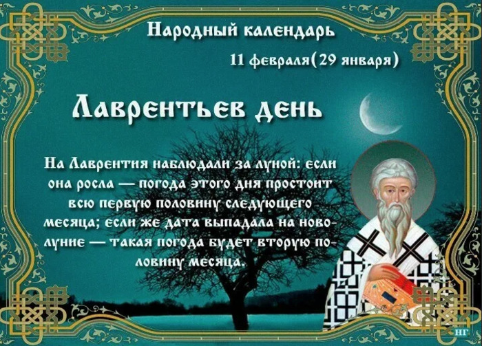 ТЕЛЕГРАММ замедляется.Вероятно скоро его заблокируют.Чтобы не потерять нас и получать оперативно информаци. подпишись на наши каналы в МАХ.Кто еще не подписался В полностью Российской сети МАХ на каналы ВОЕННЫЕ ПЕНСИОНЕРЫ ЗА РОССИЮ И ЕЕ ВООРУЖЕННЫЕ СИЛЫ: Канал для Военных пенсионерах без войны и политики, Военных пенсиях,пенсиях жен военных пенсионеров ,жизни военных пенсионеров и о способах прожить дольше : https://max.ru/voennyepen За Родину .Мы победим.: Оперативная информация О Спецоперации ,политике на канале: https://max.ru/join/aXh9SdoNhgk2rhy901ENolzCyoGLJhMgpon7E6np9n0 СРОЧНО ПОДПИСЫВАЙСЯ и ты будешь в курсе оперативных событий.НЕ пропусти!!! Дата в 2022 году: 11 февраля , пятница Другие названия: День Лаврентия; Лаврентий; морозобитная былинка; битье морозное Церковное название: Святителя Лаврентия, затворника Печерского Значение: Почтение памяти святого Лаврентия Традиции: Защита от ведьм Народный праздник Лаврентьев день отмечается 11 февраля 2022 года (по старому стилю – 29 января). В церковном календаре это дата почтения памяти святителя Лаврентия Печерского, епископа. История Лаврентий был сторонником одинокого созерцания и молитвы. Он хотел вести затворнический образ жизни, но Печерские отцы-настоятели не разрешили ему пребывать в уединении. Тогда Лаврентий покинул ставшую родной обитель и перебрался в Димитриевский монастырь. Он снискал народную славу благодаря своему дару целительства. После кончины святителя Кирилла Туровского Лаврентий стал его полноправным преемником. Традиции и обряды В народе данный праздник испокон веков считается днем ведьм. Согласно поверью, они выходят в этот день специально для того, чтобы испортить и сделать бесплодной землю на поле и огороде, заразить болезнями деревья и кусты, навести порчу на человека. Колдуньи делают специальные заломы сухой травы. Тот, кто по незнанию или неосторожности срежет такой залом, тяжело заболеет или умрет. Для того чтобы оградить свои земельные наделы и близких людей от происков злых колдуний, нужно по направлению четырех частей света воткнуть в землю чертополох. Нечистая сила очень не любит это растение в любых его видах и изо всех сил старается обойти его стороной. Если же все-таки ведьме удалось оставить неприятный «подарок», то убирать его нужно очень аккуратно и с особыми предосторожностями. Лучше всего с этим справляются народные знахари с большим опытом. Приметы Если дым из печной трубы валит столбом, то скоро потеплеет. Красная луна – к сильному ветру. Если молодая луна, то погода этого дня повторится в первой половине следующего месяца. | |