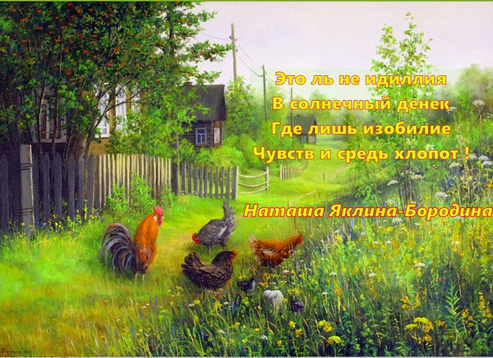 ТЕЛЕГРАММ замедляется.Вероятно скоро его заблокируют.Чтобы не потерять нас и получать оперативно информаци. подпишись на наши каналы в МАХ.Кто еще не подписался В полностью Российской сети МАХ на каналы ВОЕННЫЕ ПЕНСИОНЕРЫ ЗА РОССИЮ И ЕЕ ВООРУЖЕННЫЕ СИЛЫ: Канал для Военных пенсионерах без войны и политики, Военных пенсиях,пенсиях жен военных пенсионеров ,жизни военных пенсионеров и о способах прожить дольше : https://max.ru/voennyepen За Родину .Мы победим.: Оперативная информация О Спецоперации ,политике на канале: https://max.ru/join/aXh9SdoNhgk2rhy901ENolzCyoGLJhMgpon7E6np9n0 СРОЧНО ПОДПИСЫВАЙСЯ и ты будешь в курсе оперативных событий.НЕ пропусти!!! Летняя идиллия!!! Чепчик,распашонка Умиляют дворик Поодаль сторонка Вся в утином споре, А еще есть травка Ходят в ней цыплятки Нежная муравка Хладна и приятна! Курочка знай квохчет Что то все гребет Для цыпляток хочет Больший холодок Это ль не идиллия В солнечный денек Где лишь изобилие Чувств и средь хлопот ! А вдали - где мостик Пташки песнь слышна Скоро пойду в гости В бор - в кой влюблена! Такова Природа Только присмотрись К краскам небосвода Да и дальше в высь.. Где то да затронет Струночку души Солнце хмарь обгонит Главное - дыши Россыпью картинок В Мире естества : Луг,поля,долина Дворик у окна Пусть и впредь зарядит Лишь на позитив - Будь прекрасным с нами Как и прежде - Мир !!! Наташа Яклина-Бородина | |