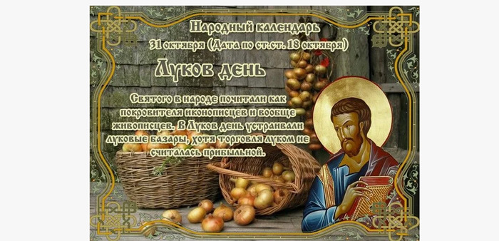 ТЕЛЕГРАММ замедляется.Вероятно скоро его заблокируют.Чтобы не потерять нас и получать оперативно информаци. подпишись на наши каналы в МАХ.Кто еще не подписался В полностью Российской сети МАХ на каналы ВОЕННЫЕ ПЕНСИОНЕРЫ ЗА РОССИЮ И ЕЕ ВООРУЖЕННЫЕ СИЛЫ: Канал для Военных пенсионерах без войны и политики, Военных пенсиях,пенсиях жен военных пенсионеров ,жизни военных пенсионеров и о способах прожить дольше : https://max.ru/voennyepen За Родину .Мы победим.: Оперативная информация О Спецоперации ,политике на канале: https://max.ru/join/aXh9SdoNhgk2rhy901ENolzCyoGLJhMgpon7E6np9n0 СРОЧНО ПОДПИСЫВАЙСЯ и ты будешь в курсе оперативных событий.НЕ пропусти!!! Лука Голодный: как 31 октября гадать по луковой шелухе на замужество Верующие 31 октября вспоминают апостола Луку На Руси этот день также называли Луковым, крестьяне верили, что лук не только укрепляет здоровье, но еще и придает храбрости и защищает дом от нечисти 31 октября православная церковь чтит апостола от семидесяти Луку, сподвижники апостола Павла, автор одного из Евангелий и Деяний святых апостолов. Апостол Лука Апостол Лука жил в I веке. Он родился в Антиохии Сирийской, возможно, в греческой просвещенной семье. О его жизни практически ничего не известно. По преданию, он с юности изучал разные науки — еврейский закон, греческую философию, живопись и медицину. Услышав о Христе, Лука прибыл в Палестину и здесь горячо воспринял христианское учение. Он был избран Иисусом Христом в число 70 апостолов и послан на первую христианскую проповедь при земной жизни Спасителя. В числе немногих верных последователей он присутствовал при распятии Христа. За эту свою преданность Лука одним из первых был сподоблен лицезрения воскресшего Иисуса, явившегося ему и апостолу Клеопе по пути в селение Еммаус. Лука принял участие во втором миссионерском путешествии апостола Павла. Есть предположение, что он был знатоком права и сопровождал Павла как юрист. Также есть версия, что Лука был врачом, возможно — на корабле (в связи с этим считается покровителем врачей). После совместного путешествия апостолы стали практически неразлучны. По преданию, именно Лука впервые занялся созданием икон. Запечатлев облик Богоматери, он стал первым в истории иконописцем. Поэтому апостол Лука считается покровителем художников. В русской церкви имеется около десяти икон, приписываемых Луке, среди них Владимирская, Тихвинская, Иверская. На Афоне и на Западе их 21 (восемь находятся в Риме). Когда Павел был казнен в Риме, Лука продолжил миссионерскую деятельность и посетил Ливию, Египет и Фиваиду. Мученическую смерть через повешение он принял в городе Фивы (Греция) в возрасте 84 лет. Мощи святого Луки по сей день находятся в Италии, в базилике Святой Иустины в Падуе. Лука Голодный или Луков день — традиции 31 октября В день памяти святого крестьяне большое внимание уделяли луку и его целебным свойствам. 31 октября в деревнях даже устраивались луковые базары, хотя торговля им редко приносила хорошую прибыль. Считалось, что 31 октября каждый должен съесть немного лука, чтобы укрепить здоровье и защитить себя от болезней. Люди верили, что лук, съеденный в Луков день, может излечить даже от хронических заболеваний. О луке сохранилось немало поговорок: «Съесть лук — избавиться от мук», «Лук от семи недуг», «Лук да баня все правят» и другие. Верили, что лук не только укре