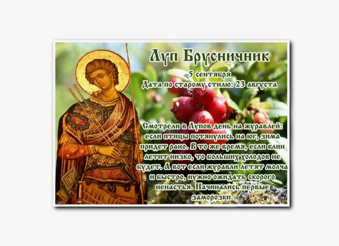 ТЕЛЕГРАММ замедляется.Вероятно скоро его заблокируют.Чтобы не потерять нас и получать оперативно информаци. подпишись на наши каналы в МАХ.Кто еще не подписался В полностью Российской сети МАХ на каналы ВОЕННЫЕ ПЕНСИОНЕРЫ ЗА РОССИЮ И ЕЕ ВООРУЖЕННЫЕ СИЛЫ: Канал для Военных пенсионерах без войны и политики, Военных пенсиях,пенсиях жен военных пенсионеров ,жизни военных пенсионеров и о способах прожить дольше : https://max.ru/voennyepen За Родину .Мы победим.: Оперативная информация О Спецоперации ,политике на канале: https://max.ru/join/aXh9SdoNhgk2rhy901ENolzCyoGLJhMgpon7E6np9n0 СРОЧНО ПОДПИСЫВАЙСЯ и ты будешь в курсе оперативных событий.НЕ пропусти!!! Дата в 2024 году: 5 сентября , четверг Другие названия: Луп; лупенские морозы Церковное название: Мученика Луппа Солунского (Фессалоникийского) Значение: Почтение памяти святого Луппа Традиции: Сбор брусники и приготовление блюд из нее; уборка льна и овса Народный праздник Луп Брусничник отмечается 5 сентября 2024 года (дата по старому стилю – 23 августа). В этот день православной церковью чтится память мученика Луппа. Он был родом из города Солуни, жил в III веке н. э. Являлся рабом Димитрия Солунского, казненного за христианское вероисповедание. После смерти хозяина Лупп взял его перстень и окропил свои одежды его кровью. Благодаря имени великомученика, перстню и своей вере, впоследствии он смог сотворить немало чудес в родном городе. Так как это было время ярой борьбы язычников с христианской верой, Луппа много раз пытались арестовать. Но Всевышний оберегал его, хоть будущий святой и не был крещен. Однажды, когда вода пролилась на Луппа прямо с неба, он понял, что это знак и он теперь христианин, и сам отдался в руки мучителям. Традиции и обряды Обычно в этот день случаются заморозки, в народе именуемые «лупенскими», после которых идут в лес собирать созревшую бруснику. Отсюда и название праздника «Брусничник». Мужчины с утра отправляются на поля убирать лен и овес. Женщины, закончив утренние хозяйственные дела, берут детей и идут в лес за ягодой. Брусника издревле славится своими целебными свойствами. Сок ягод хорошо помогает при простуде. Чай из брусничных листьев врачует «разгулявшийся» кишечник и восстанавливает «уставшую» печень. К ужину на стол ставятся традиционные пироги с брусникой. Приметы Брусника созрела, значит, и овес уже можно убирать. С утра нет мороза – до конца сентября погода будет теплой. Журавли двинулись в теплые края – зима наступит рано. Если журавлиный клин низко – зима будет теплой, а если высоко – это к частым морозам. Если курлыки летят молча, низко и торопливо, значит, скоро наступят ненастные дни. | |