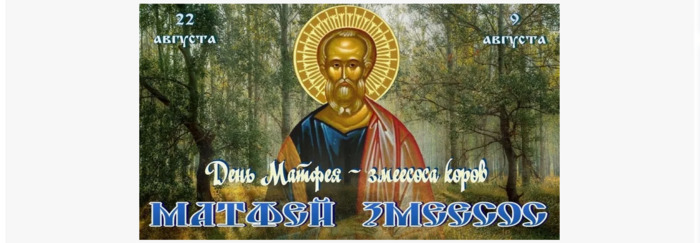 ТЕЛЕГРАММ замедляется.Вероятно скоро его заблокируют.Чтобы не потерять нас и получать оперативно информаци. подпишись на наши каналы в МАХ.Кто еще не подписался В полностью Российской сети МАХ на каналы ВОЕННЫЕ ПЕНСИОНЕРЫ ЗА РОССИЮ И ЕЕ ВООРУЖЕННЫЕ СИЛЫ: Канал для Военных пенсионерах без войны и политики, Военных пенсиях,пенсиях жен военных пенсионеров ,жизни военных пенсионеров и о способах прожить дольше : https://max.ru/voennyepen За Родину .Мы победим.: Оперативная информация О Спецоперации ,политике на канале: https://max.ru/join/aXh9SdoNhgk2rhy901ENolzCyoGLJhMgpon7E6np9n0 СРОЧНО ПОДПИСЫВАЙСЯ и ты будешь в курсе оперативных событий.НЕ пропусти!!! В Телеграмм создана группа " Военные пенсионеры за Россию и ее ВС. Мы победим". У кого есть Телеграмм просим вступить в нее. Там много интересного, срочного, очень оперативная информация, а также чего нельзя помещать в ОДНОКЛАССНИКАХ и на сайте. Вступить можно по ссылке: Военные пенсионеры за Россию и ее ВС. Мы победим "https://t.me/voenpenszaRossiu" Очень большая просьба НЕ ОТПИСЫВАТЬСЯ ОТ КАНАЛА, Канал работает в тестовом режиме. Мы стараемся понять, что Вам будет интересно читать и как работать дальше. Пишите, что бы Вам хотелось читать в ТЕЛЕГРАММ. Хоть в любой теме на сайте, хоть в Телеграмм. Чтобы не раздражали уведомления их можно ОТКЛЮЧИТЬ. Кого раздражают уведомления в Телеграмм их можно отключить. Отключить уведомления можно нажав на надпись ОТКЛЮЧИТЬ УВЕДОМЛЕНИЯ внизу Дата в 2025 году: 22 августа , пятница Другие названия: Матвей; Матвей ненастный; День Матфея; Змеесос коров Церковное название: Апостола Матфия Значение: Почтение памяти апостола Матфия Традиции: Коров не выпускают на пастбище Народный праздник Матфей Змеесос отмечается 22 августа 2025 года (старый стиль – 9 августа). В этот день православная церковь почитает апостола Матфия. Святой родился в Вифлееме. С малых лет был учеником Симеона Богоприимца. После встречи Христа неотступно следовал за ним везде. После предательства Иуды и Вознесения Господня был избран двенадцатым апостолом, и в числе прочих проповедовал во многих городах. Неоднократно Господь отводил опасность от Матфия. По возвращении в Иудею святой был схвачен по приказу иудейского первосвященника Анана (люто ненавидящего все, что было связано с христианством), осужден и приговорен к смертной казни. Традиции и обряды В народе праздник получил название «Змеесос» по старому поверью, которое гласит, что именно 22 августа змеи нападают на коров. Вопреки ожиданиям, они не кусают, а присасываются к вымени и пьют молоко. Помня об этом, хозяева в этот день оставляют животных дома, не выпуская на пастбище. Доить их стараются в одиночестве и за закрытыми дверьми хлева, опасаясь «змеиного глаза». Соблюдая обряд, подойник не ставится на табурет или бадью, а зажимается коленями, иначе может пропасть молоко у коровы. Приметы Про работу в поле в этот день говорили: «На Матвея ненастного всякий труд напрасный». Если ветер южный и вихревой – зимой много снега будет. На Матвея летний дождь с осенним встречается. | |