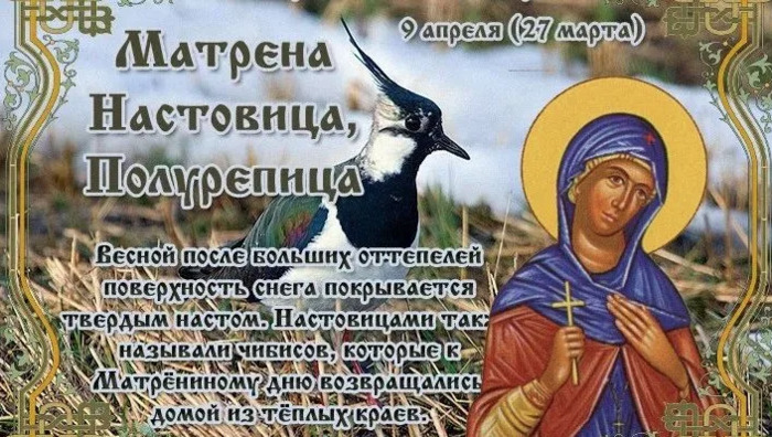 ТЕЛЕГРАММ замедляется.Вероятно скоро его заблокируют.Чтобы не потерять нас и получать оперативно информаци. подпишись на наши каналы в МАХ.Кто еще не подписался В полностью Российской сети МАХ на каналы ВОЕННЫЕ ПЕНСИОНЕРЫ ЗА РОССИЮ И ЕЕ ВООРУЖЕННЫЕ СИЛЫ: Канал для Военных пенсионерах без войны и политики, Военных пенсиях,пенсиях жен военных пенсионеров ,жизни военных пенсионеров и о способах прожить дольше : https://max.ru/voennyepen За Родину .Мы победим.: Оперативная информация О Спецоперации ,политике на канале: https://max.ru/join/aXh9SdoNhgk2rhy901ENolzCyoGLJhMgpon7E6np9n0 СРОЧНО ПОДПИСЫВАЙСЯ и ты будешь в курсе оперативных событий.НЕ пропусти!!! Дата в 2023 году: 9 апреля , воскресенье Другие названия: Матрона; День Матрены-полурепницы; День святой Матрены; Полутрепица; День Матрены-настовницы; пигалица Церковное название: Мученицы Матроны Солунской (Фессалоникийской) Значение: Почтение памяти святой Матроны Традиции: Домашние хлопоты; осмотр запасов продуктов с зимы Народный праздник Матрена Настовица (Полурепица) отмечается 9 апреля 2023 года (по старому стилю – 27 марта). В церковном календаре это дата почтения памяти мученицы Матроны Солунской (Фессалоникийской). Названия «Настовица» и «Настовница» день получил из-за наста – твердой корки на снегу, часто появляющейся после оттепели. Так же величают чибиса, который возвращается в этот период из теплых стран. «Полурепицей» день прозвали за обычай перебирать репу, которая издавна считается одним из главных блюд на крестьянском столе. История Матрона Солунская жила в III-IV столетиях. Она была рабыней Павтилы – жены солунского военачальника, которая постоянно заставляла ее отречься от христианства. В очередной раз, когда девушка тайно пошла в церковь, хозяйка узнала об этом, сильно ее избила, связала и закрыла в каморке. На следующий день она нашла свою рабыню без пут на руках и без следов побоев. Разгневанная женщина избила Матрону до полусмерти. Вновь связала ее и закрыла каморку на замок, оставив девушку без воды и еды. Через четыре дня Павтила открыла дверь в надежде, что рабыня будет просить о пощаде. Но Матрона снова стояла на коленях без веревок на теле и в полном здравии. Она возносила молитвы Господу. Ярость затуманила глаза женщине. Павтила сильно избила Матрону палками, после чего вновь заточила. Девушка не пережила последнего истязания и скончалась. Со стены своего дома, который стоял высоко, хозяйка скинула тело несчастной. Сострадающие христиане подобрали его и со всеми надлежащими почестями предали земле. Традиции и обряды Святая Матрона почитается у славян как покровительница и заступница хозяек. В данный праздник женщины просят у нее поддержки и помощи в хлопотах по дому, которым полностью посвящают этот день. Оставшиеся с зимы запасы продуктов подвергают тщательному осмотру. Определяют, что нужно выбросить, что отложить на семена, что для употребления в пищу. Особое внимание уделяют репе. Она известна своими дезинфицирующими, мочегонными и антивоспалительными свойствами. Ее применяют при авитаминозе, болезнях желудка и кишечника, камнях в почках и ревматизме. В этот день молятся святой Матроне о хорошем урожае овоща. Приметы Утренний иней с туманом предвещает урожайный год. Чибис вечером раскричался – завтрашний день будет ясным. Если стайка чибисов низко летает, то в ближайшие дни будет сухо