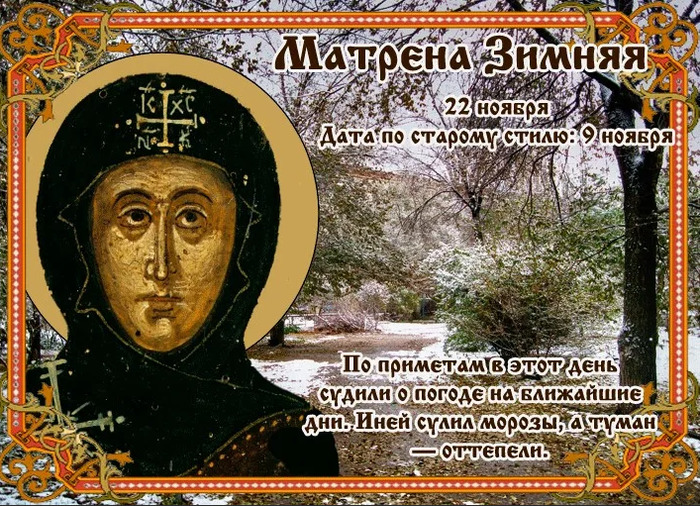 ТЕЛЕГРАММ замедляется.Вероятно скоро его заблокируют.Чтобы не потерять нас и получать оперативно информаци. подпишись на наши каналы в МАХ.Кто еще не подписался В полностью Российской сети МАХ на каналы ВОЕННЫЕ ПЕНСИОНЕРЫ ЗА РОССИЮ И ЕЕ ВООРУЖЕННЫЕ СИЛЫ: Канал для Военных пенсионерах без войны и политики, Военных пенсиях,пенсиях жен военных пенсионеров ,жизни военных пенсионеров и о способах прожить дольше : https://max.ru/voennyepen За Родину .Мы победим.: Оперативная информация О Спецоперации ,политике на канале: https://max.ru/join/aXh9SdoNhgk2rhy901ENolzCyoGLJhMgpon7E6np9n0 СРОЧНО ПОДПИСЫВАЙСЯ и ты будешь в курсе оперативных событий.НЕ пропусти!!! Дата в 2023 году: 22 ноября , среда Другие названия: Матрона зимняя, Матрона ноябрьская, Матренин день, Матрена наставница, Зимний день, Зима становится Церковное название: Преподобной Матроны Значение: Почтение памяти святой Матроны Традиции: Заваривание лечебных трав и корешков; раздача ненужных вещей нуждающимся Народный праздник Матрены зимние отмечается 22 ноября 2015 года (дата по старому стилю – 9 ноября). Верующие православной церкви в этот день чтут память преподобной Матроны Константинопольской. История Матрона родилась в V веке в городе Пергии (Малая Азия). По достижении брачного возраста ее выдали замуж за Дометиана. У них родилась дочь Феодотия. После ее рождения они переехали в Константинополь. Матрона любила бывать в храме, где и проводила все дни в молитвах и плаче о грехах. Вскоре она познакомилась с двумя старицами и решила оставить мирскую жизнь. Отдав дочь на воспитание одной из стариц, женщина остригла волосы и нашла приют в мужском монастыре, выдав себя за евнуха Вавилу. Спустя несколько месяцев игумену обители привиделся сон, что евнух Вавила – женщина. Тогда он вызвал Матрону и велел рассказать, по какой причине она решила поселиться в мужском монастыре. Женщина поведала ему все о своей жизни. Тогда игумен отправил ее в женский монастырь, находящийся в городе Емес, где после смерти игуменьи она стала настоятельницей. Слава о Матроне, ее доброте и чудодейственной силе облетела многие города, достигнув слуха Дометиана. Он явился в монастырь с целью поговорить с ней, но она тайно оставила свое место и перебралась в Иерусалим, оттуда – на гору Сенай, а затем в заброшенный храм язычников в Берите. Проживающие в округе люди начали навещать ее, и многих Матрона обратила в христианскую веру. На этом месте был образован новый женский монастырь. Вскоре Матроне было видение, что что-то случилось с ее супругом. Она вернулась в Константинополь, где узнала о смерти мужа. С разрешения преподобного Вассиана Матрона основала здесь новый монастырь, в который прибыли ее сестры из Беритской обители. Святая оставила земной мир в возрасте 100 лет, и душа ее переселилась в рай. Традиции и обряды В этот день женщины традиционно заваривают собранные корешки и лечебные травы. На Матрону пересматриваются все вещи. Неподходящую по размеру либо старую одежду отдают нуждающимся. Ямщики, получившие в этот день монету от последнего седока, прятали ее под пятку и произносили определенные слова. Согласно поверью, это помогало найти нового седока и, следовательно, новый заработок. Сейчас так поступают некоторые таксисты. Приметы Если иней виден невооруженным взглядом, то в следующем году уродится овес. Если на Матрены зимние начался до