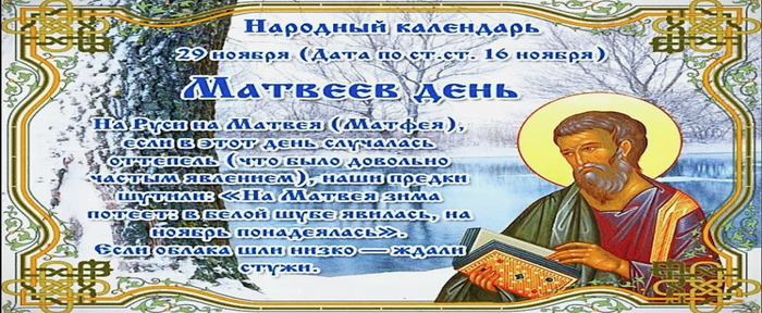 ТЕЛЕГРАММ замедляется.Вероятно скоро его заблокируют.Чтобы не потерять нас и получать оперативно информаци. подпишись на наши каналы в МАХ.Кто еще не подписался В полностью Российской сети МАХ на каналы ВОЕННЫЕ ПЕНСИОНЕРЫ ЗА РОССИЮ И ЕЕ ВООРУЖЕННЫЕ СИЛЫ: Канал для Военных пенсионерах без войны и политики, Военных пенсиях,пенсиях жен военных пенсионеров ,жизни военных пенсионеров и о способах прожить дольше : https://max.ru/voennyepen За Родину .Мы победим.: Оперативная информация О Спецоперации ,политике на канале: https://max.ru/join/aXh9SdoNhgk2rhy901ENolzCyoGLJhMgpon7E6np9n0 СРОЧНО ПОДПИСЫВАЙСЯ и ты будешь в курсе оперативных событий.НЕ пропусти!!! Дата в 2025 году: 29 ноября , суббота Другие названия: Матвей, Матвей – зима отпотей, Зима потеет Церковное название: Апостола и евангелиста Матфея Значение: Почтение памяти апостола от 12-ти, евангелиста Левия Матфея Традиции: Ходят в гости Народный праздник Матвеев день отмечается 29 ноября 2025 года (по старому стилю – 16 ноября). В церковном календаре это дата почтения памяти апостола от 12-ти, евангелиста Левия Матфея. В народе он получил прозвище «Зима отпотей», так как в этот день наблюдались оттепели. История В библейских сказаниях о святом Матфее мало сведений, но известно доподлинно, что он являлся одним из учеников Иисуса Христа и был особо близко приближен к нему. До встречи с Господом Богом он был мытарем и занимался самым унизительным делом для иудеев – сбором налогов, пошлин и податей. Затем принял христианскую веру и следовал за Иисусом во всех путешествиях. Через 8 лет после казни и вознесения Христа он написал Евангелие, а затем отправился нести Слово Божие в далекие страны. Скончался от мучительной смерти – был казнен огнем в крепости Апасарос (Римская империя). Традиции и обряды В этот народный праздник принято ходить в гости. Несмотря на то, что он приходится на Рождественский пост, и на столах стоит только дозволенная пища, это не мешает разговорам и приятным посиделкам. Согласно обычаю, после прихода нежелательных гостей сразу же надо протереть все зеркала, а также помыть входную дверь и пол. А если вы кого-то ждете, а он все не приходит, то нужно воткнуть булавку сверху в ручку веника и поставить его у входа. Приметы День на Матвея холодный – зима лютая. Если же день теплый и дождливый – зима теплая и мягкая. Если дует сильный ветер, то зима будет с вьюгами и метелью. Если облака по небу низко плывут, то скоро наступит студеная погода. Выпавший в Матвеев день снег не растает до половодья. Если в направлении сильного ветра бросить жменьку сырой крупы, то он быстро затихнет. Нельзя покидать дом в вывернутой одежде – день будет неудачным, свистеть – появятся тараканы, садиться на стол – быть беде, ходить по дому в одном ботинке и искать второй – в доме появится смерть. Лучше не одевать одежду красного цвета и не сильно часто любоваться в зеркало. | |