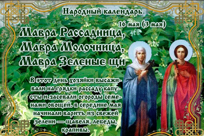 ТЕЛЕГРАММ замедляется.Вероятно скоро его заблокируют.Чтобы не потерять нас и получать оперативно информаци. подпишись на наши каналы в МАХ.Кто еще не подписался В полностью Российской сети МАХ на каналы ВОЕННЫЕ ПЕНСИОНЕРЫ ЗА РОССИЮ И ЕЕ ВООРУЖЕННЫЕ СИЛЫ: Канал для Военных пенсионерах без войны и политики, Военных пенсиях,пенсиях жен военных пенсионеров ,жизни военных пенсионеров и о способах прожить дольше : https://max.ru/voennyepen За Родину .Мы победим.: Оперативная информация О Спецоперации ,политике на канале: https://max.ru/join/aXh9SdoNhgk2rhy901ENolzCyoGLJhMgpon7E6np9n0 СРОЧНО ПОДПИСЫВАЙСЯ и ты будешь в курсе оперативных событий.НЕ пропусти!!! Дата в 2022 году: 16 мая , понедельник Другие названия: Рассадница; Мавра Молочница; Марфа молочная; молочницы; Мавра (Марфа) – зеленые щи; зеленые щи; Маврушка; коровьи заботницы; Мавра и Тимофей Церковное название: Мученика Тимофея и мученицы Мавры Значение: День памяти святой мученицы Мавры и ее супруга – мученика Тимофея, чтеца Традиции: Посев и высадка рассады капусты; приготовление молочной каши, борща, щей Народный праздник Мавра Рассадница отмечается 16 мая 2022 года (по старому стилю – 3 мая). В православном церковном календаре это дата памяти мученицы Мавры и ее мужа – мученика Тимофея, чтеца. На Руси святую стали называть более привычным именем – Марфой. Название «Рассадница» праздник получил за то, что 16 мая считается благоприятным днем для посева и высадки в открытый грунт рассады капусты. «Молочным» день назвали в честь молока. К этому сроку коровы уже наедаются свежей сочной травы, отчего дают вкусное молоко. Название «Зеленые щи» день получил за зелень. В этот период она уже появляется на грядках и, соответственно, на столах, в так любимых на Руси борщах и щах. История Мавра жила в III веке в Фиваде Египетской. Она была язычницей. Вышла замуж за чтеца местной христианской церкви Тимофея. Влюбленные поженились в то время, когда повсеместно шли гонения на христиан императором Диоклетианом. В 286 году на Тимофея донесли местному правителю Ариану. Его доставили к нему на суд. Тимофея арестовали. Обвинили в распространении чуждой язычникам христианской веры и хранении богослужебных книг. Во время пыток к Тимофею пришла Мавра. Она добровольно признала себя христианкой и выразила желание разделить мучения с мужем. Правитель узнал об этом. Он разъярился и приказал вырвать ей волосы и бросить в чан с кипятком. После многочисленных пыток Мавру и Тимофея распяли. Девять суток мученики провели на крестах, глядя друг на друга. На десятые Господь призвал их души к себе. Традиции и обряды В этот народный праздник сеют и высаживают в открытый грунт рассаду капусты. Чтобы защитить от вредителей, опрыскивают ее святой водой. Готовят молочную кашу. Считается, что она прибавляет здоровья. Готовят борщи и щи с зеленью. Приметы Обильная роса – к богатому урожаю огурцов. Много росы на рассвете – к погожим дням. Ее отсутствие говорит о скором дожде. Если листья на ясене еще не расправились, а дуб уже красуется зеленью – лето будет сухим. Черемуха зацвела – жди похолодания. Если цветов много, значит, летом выпадет много осадков | |