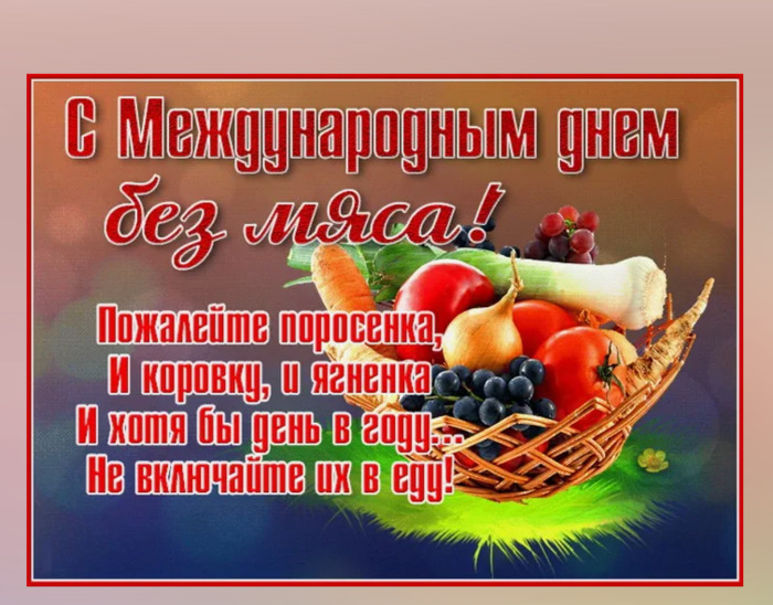 ТЕЛЕГРАММ замедляется.Вероятно скоро его заблокируют.Чтобы не потерять нас и получать оперативно информаци. подпишись на наши каналы в МАХ.Кто еще не подписался В полностью Российской сети МАХ на каналы ВОЕННЫЕ ПЕНСИОНЕРЫ ЗА РОССИЮ И ЕЕ ВООРУЖЕННЫЕ СИЛЫ: Канал для Военных пенсионерах без войны и политики, Военных пенсиях,пенсиях жен военных пенсионеров ,жизни военных пенсионеров и о способах прожить дольше : https://max.ru/voennyepen За Родину .Мы победим.: Оперативная информация О Спецоперации ,политике на канале: https://max.ru/join/aXh9SdoNhgk2rhy901ENolzCyoGLJhMgpon7E6np9n0 СРОЧНО ПОДПИСЫВАЙСЯ и ты будешь в курсе оперативных событий.НЕ пропусти!!! Дата в 2024 году: 20 марта , среда Празднуется: в России, Украине, Беларуси и других странах мира Другие названия: в 1985 году Традиции: магазины и рестораны не продают мясо; активисты общественных фондов, защитники природы распространяют идеи вегетарианства, гуманного отношения к животным, защиты экологии; люди делятся опытом вегетарианских практик, рецептами блюд без мяса Мясо – незаменимый продукт для многих людей. Чрезмерное употребление животноводческих блюд способно негативно повлиять на здоровье человека. Для обращения внимания социума на идеи отказа от мясных изделий, увеличения уровня знаний о вегетарианстве, борьбы против негуманного содержания животных учрежден международный праздник. Когда проходит Международный день без мяса отмечается ежегодно 20 марта. В 2024 году дату справляют в России, Украине, Беларуси и других странах. Кто отмечает В международном празднике участвуют активисты общественных движений, благотворительных организаций, исследователи питания, врачи, люди, которые увлекаются вегетарианством и здоровым образом жизни. К ним присоединяются их друзья, родственники, знакомые, близкие люди. История и традиции праздника Событие впервые отметили в 1985 году. В этот день торговые учреждения, заведения питания не отпускают мясо. Участники общественных фондов, благотворительных учреждений, защитники животных проводят флешмобы и акции. Они распространяют идеи вегетарианства, гуманного отношения к животным, защиты экологии. Организуются конференции, лекции, семинары, тренинги. Выдвигаются идеи по совершенствованию природоохранного законодательства. Звучат доклады об актуальных проблемах питания людей и методах их ликвидации. Люди обмениваются опытом вегетарианских практик. Мастера кулинарии делятся рецептами гастрономических блюд. Распространяются идеи отказа от мясных продуктов. Обсуждаются исследования, книги, которые посвящены пище. Устраиваются мероприятия в кругу диетологов. В ряде стран праздник приобрел государственную поддержку. В России праздник впервые отметили в 2012 году. В Санкт-Петербурге активисты вручали прохожим фрукты и листовки о пользе растительного питания. Интересные факты Исследователи утверждают, что человечество ежегодно убивает 60 миллиардов животных без учета обитателей воды. Животноводство выделяет в атмосферу на 20% больше «парниковых газов», чем транспорт. Мясо содержит необходимые человеческому организму аминокислоты. Его пытаются выращивать в пробирке с химическим составом, близким к натуральным. Ряд правительств финансирует исследовательскую программу по изготовлению синтетического продукта. Его пока не используют в коммерческих целях. Высшие прим