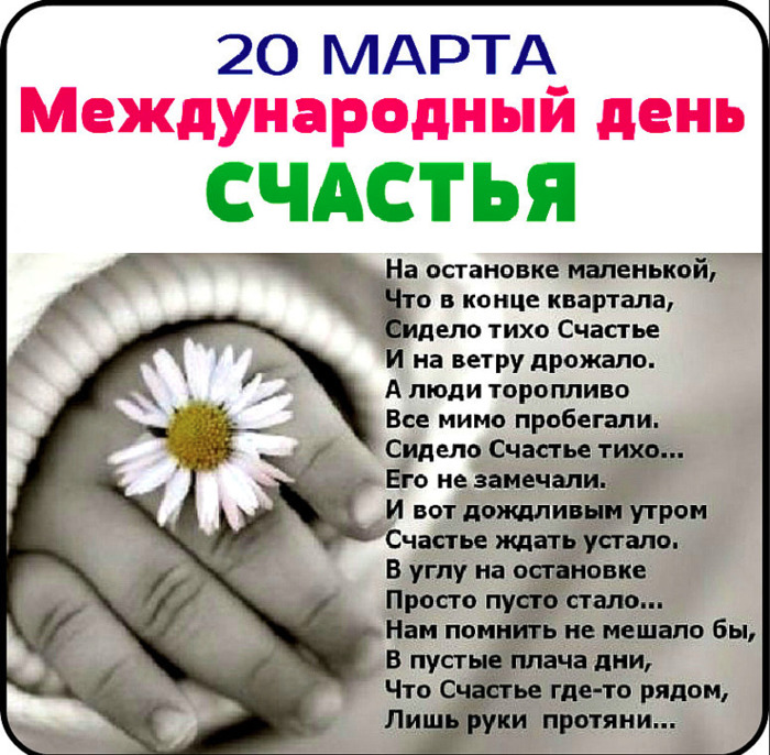 ТЕЛЕГРАММ замедляется.Вероятно скоро его заблокируют.Чтобы не потерять нас и получать оперативно информаци. подпишись на наши каналы в МАХ.Кто еще не подписался В полностью Российской сети МАХ на каналы ВОЕННЫЕ ПЕНСИОНЕРЫ ЗА РОССИЮ И ЕЕ ВООРУЖЕННЫЕ СИЛЫ: Канал для Военных пенсионерах без войны и политики, Военных пенсиях,пенсиях жен военных пенсионеров ,жизни военных пенсионеров и о способах прожить дольше : https://max.ru/voennyepen За Родину .Мы победим.: Оперативная информация О Спецоперации ,политике на канале: https://max.ru/join/aXh9SdoNhgk2rhy901ENolzCyoGLJhMgpon7E6np9n0 СРОЧНО ПОДПИСЫВАЙСЯ и ты будешь в курсе оперативных событий.НЕ пропусти!!! Дата в 2023 году: 20 марта , понедельник Учрежден: резолюцией № A/RES/66/281 Генеральной Ассамблеи ООН 28.06.2012 г. Традиции: лекции, семинары, конференции, тренинги; акции, флешмобы Международный день счастья отмечается 20 марта. В торжествах участвуют деятели общественных движений, благотворительных фондов, психологи, философы. В 2023 году праздник проходит 11-й раз. Цель Международного дня счастья: обратить внимание людей на удовлетворенность жизнью и поддержать их стремление быть счастливыми. История праздника Международный день счастья учредила резолюция № A/RES/66/281 Генеральной Ассамблеи ООН от 28 июня 2012 года. Инициатором праздника выступило Королевство Бутан. Его предложение одобрили представители всех государств-членов ООН. Традиции праздника В Международный день счастья проводятся лекции, семинары, конференции, тренинги. Участники распространяют идеи позитивного отношения к жизни и окружающим, выдвигают идеи по улучшению быта и совершенствованию общества. Библиотеки устраивают презентации книг и исследований, посвященных счастью. В образовательных заведениях проходят просветительские занятия. Участники общественных движений и благотворительных фондов организуют акции, флешмобы. Интересные факты Ученые Университета Миннесоты выяснили, что счастье зависит на 50% от генов, на 10% – от условий жизни (работа, семья) и на 40% – от мыслей. Ученые считают, что лучший цвет для счастья – желтый. По данным исследовательского центра «Институт Земли», в 2016 году Дания стала наиболее счастливой страной. За ней расположились Швейцария, Исландия, Норвегия и Финляндия. Россия заняла 56 место. Всего в рейтинге присутствовало 157 стран. Последнее место заняла Бурунди. Физиология счастья связана с тремя гормонами: эндорфинами, дофамином и серотонином. Эндорфины влияют на кратковременные состояния эйфории. Дофамин создает фон счастья и продолжительную удовлетворенность. Серотонин дарит прилив сил и хорошее настроение, повышает сопротивляемость организма стрессам. Выработка веществ нарушается при вирусных, эндокринных и бактериальных заболеваниях. Восточные философии утверждают, что счастье недостижимо. Ангедония – потеря или снижение способности получать удовольствие. Описана в 1886 году как следствие заболеваний печени. Чтобы почувствовать себя счастливее, психологи рекомендуют обеспечить полноценный сон, заниматься спортом, общаться с приятными людьми, помогать окружающим, путешествовать, улыбаться. | |