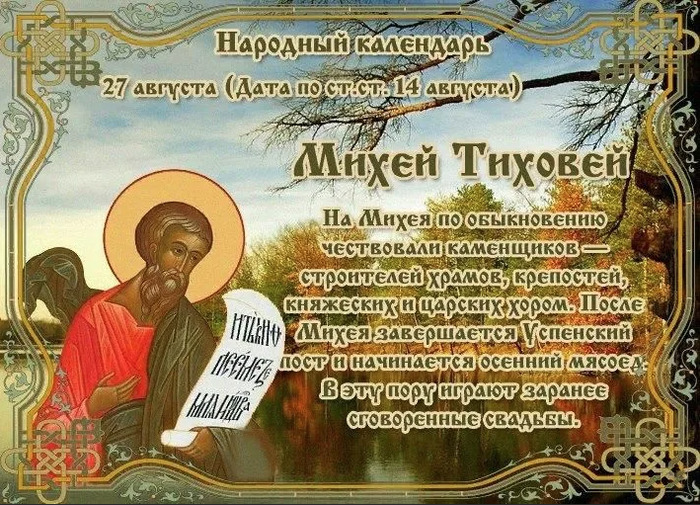 ТЕЛЕГРАММ замедляется.Вероятно скоро его заблокируют.Чтобы не потерять нас и получать оперативно информаци. подпишись на наши каналы в МАХ.Кто еще не подписался В полностью Российской сети МАХ на каналы ВОЕННЫЕ ПЕНСИОНЕРЫ ЗА РОССИЮ И ЕЕ ВООРУЖЕННЫЕ СИЛЫ: Канал для Военных пенсионерах без войны и политики, Военных пенсиях,пенсиях жен военных пенсионеров ,жизни военных пенсионеров и о способах прожить дольше : https://max.ru/voennyepen За Родину .Мы победим.: Оперативная информация О Спецоперации ,политике на канале: https://max.ru/join/aXh9SdoNhgk2rhy901ENolzCyoGLJhMgpon7E6np9n0 СРОЧНО ПОДПИСЫВАЙСЯ и ты будешь в курсе оперативных событий.НЕ пропусти!!! Дата в 2022 году: 27 августа , суббота Другие названия: Михей; Михеев день; Узорник; День каменщиков; Камнеклад; Камнерез Церковное название: Пророка Михея (из 12-ти пророков) Значение: Почтение памяти одного из 12 пророков – Михея Традиции: Окончание полевых работ; чествование каменщиков Народный праздник Михей Тиховей отмечается 27 августа 2022 года. В церковном календаре – это день почитания Михея Морасфитянина, одного из 12 малых пророков. Святой открыл в себе дар предсказания во второй половине VIII века до рождения Мессии. Почти полвека он отдал служению своему дару. Некоторое время жил с великим пророком Исаией. Написал книгу пророчеств. Первым предсказал падение царства Иудейского за грехи правящих. Пророчил про Израильское царство со множеством обличений. Но были у Михея и вселяющие надежду предсказания. Одним из них было пророчество о приходе на землю Христа. Израильский царь Ахава очень ненавидел Михея за постоянные обличения последнего в неправедных и идолопоклоннических поступках, но, боясь гнева Всевышнего и исполнения предсказаний, не трогал его. Традиции и обряды В народе 27 августа празднуется как День каменщика. Строители храмов и каменных дел мастера всегда пользовались уважением на Руси. Некоторые их даже побаивались и старались понапрасну не сердить и не обижать. Ведь каменщик знает много секретов, как построить дом, чтобы он простоял не одну сотню лет, а в отместку может сделать с ним что-нибудь неладное. 27 августа – последний день Успенского поста. Начинается осенний мясоед – время свадеб. Наши предки старались в этот день закончить все работы в поле. Помогали и тем, у кого не было мужчины в доме – вдовам и сиротам. Народное название «Тиховей» праздник получил из-за наблюдений за ветром в этот день. Приметы Если на Михея Тиховея журавли не полетели – это значит, что зима будет поздней, если же сорвались – быть морозу в середине осени. Если на Михея ветер сильный, то сентябрь будет дождливым. Северный ветер – к хорошему урожаю ржи. | |