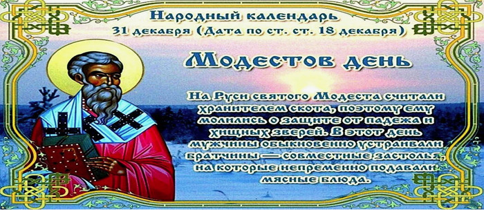 ТЕЛЕГРАММ замедляется.Вероятно скоро его заблокируют.Чтобы не потерять нас и получать оперативно информаци. подпишись на наши каналы в МАХ.Кто еще не подписался В полностью Российской сети МАХ на каналы ВОЕННЫЕ ПЕНСИОНЕРЫ ЗА РОССИЮ И ЕЕ ВООРУЖЕННЫЕ СИЛЫ: Канал для Военных пенсионерах без войны и политики, Военных пенсиях,пенсиях жен военных пенсионеров ,жизни военных пенсионеров и о способах прожить дольше : https://max.ru/voennyepen За Родину .Мы победим.: Оперативная информация О Спецоперации ,политике на канале: https://max.ru/join/aXh9SdoNhgk2rhy901ENolzCyoGLJhMgpon7E6np9n0 СРОЧНО ПОДПИСЫВАЙСЯ и ты будешь в курсе оперативных событий.НЕ пропусти!!! Дата в 2025 году: 31 декабря , среда Другие названия: Модест, Скотохранитель, Покров скота, новолетье Церковное название: Святителя Модеста, архиепископа Иерусалимского Значение: День памяти святого Модеста Традиции: Молитвы о защите скота; гадания на судьбу, погоду; мужчины устраивают братчины (совместные застолья) с обязательным присутствием мясных блюд; женщинам запрещено играть в карты Народный праздник Модестов день отмечается 31 декабря 2025 года (по старому стилю – 18 декабря). В церковном календаре это дата почтения памяти святителя Модеста, архиепископа Иерусалимского. История Модест родился в VII веке в городе Севастии (Малая Азия) в христианской семье. Уже в юные годы он решил посвятить себя Господу Богу и вести иноческий образ жизни. Повзрослев, был пострижен в монахи. Ведя Богоугодную жизнь, старательно исполнял все обязанности, возложенные на него, что позволило ему стать настоятелем монастыря святого Феодосия Великого. Во время войны с персидским царем Хозроем многие храмы были уничтожены, а христиане убиты. Иерусалимского патриарха взяли в плен. Модест был назначен временным блюстителем Иерусалимской церкви. С благословения Александрийского патриарха он отстроил заново разрушенные храмы и совершил погребение останков убитых христиан. 14 лет спустя из плена возвратился Иерусалимский патриарх Захария и продолжил управлять патриаршей кафедрой. После смерти Захария Модест занял его место. Традиции и обряды Святой Модест считается заступником домашних животных. В этот день христиане молят его о помощи и сохранении скотины от мора и лесных зверей. Женщинам в этот праздник запрещается играть в карты, а мужчины собираются за общим столом, на котором обязательно должно быть мясо, как знак благодарности Модесту за покровительство над скотом. В Модестов день предсказывают судьбу. Для этого нужно прийти и лечь на току. Если послышится звук молотьбы – быть человеку богатым, если звон – выйдет замуж (женится), а если стук – к скорой гибели. Этот день считается самым разгульным для нечистой силы. Если в другие дни она шалила только ночью, то 31 декабря гуляет целые сутки. Поэтому запрещается оставлять неприкрытое молоко или ножи. В этот день определяют, какой из 12-ти месяцев в следующем году будет самым дождливым. Вечером в 12 маленьких коробочек насыпают соль и на каждой пишут название месяца. В какой из них соль станет мокрой поутру, в том месяце, значит, будет больше всего осадков. Приметы Если снег при ходьбе не хрустит или подул западный (юго-западный) ветер, то скоро наступит потепление. Если поле снегом не покрылось, то год будет неурожайным. | |