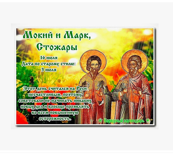 ТЕЛЕГРАММ замедляется.Вероятно скоро его заблокируют.Чтобы не потерять нас и получать оперативно информаци. подпишись на наши каналы в МАХ.Кто еще не подписался В полностью Российской сети МАХ на каналы ВОЕННЫЕ ПЕНСИОНЕРЫ ЗА РОССИЮ И ЕЕ ВООРУЖЕННЫЕ СИЛЫ: Канал для Военных пенсионерах без войны и политики, Военных пенсиях,пенсиях жен военных пенсионеров ,жизни военных пенсионеров и о способах прожить дольше : https://max.ru/voennyepen За Родину .Мы победим.: Оперативная информация О Спецоперации ,политике на канале: https://max.ru/join/aXh9SdoNhgk2rhy901ENolzCyoGLJhMgpon7E6np9n0 СРОЧНО ПОДПИСЫВАЙСЯ и ты будешь в курсе оперативных событий.НЕ пропусти!!! Дата в 2024 году: 16 июля , вторник Другие названия: Мокей (Мокий); Мокий и Демид; Демид; Маков день; Сажар; Волосожары Церковное название: Мучеников Мокия и Марка Значение: Почтение памяти мучеников Мокия и Марка Традиции: Сенокос; охота; сбор мака Народный праздник Мокий и Марк, Стожары отмечается 16 июля 2024 года (дата по старому стилю – 3 июля). Православная церковь в этот день чтит память мучеников Мокия и Марка. Стожарами древние славяне называли Плеяду – скопление небесных светил в созвездии Тельца, которые были хорошо видны невооруженным глазом в это время года. Название праздника «Маков день» связано со сбором мака в этот период. История Братья по вере Мокий и Марк жили в III веке. Во время гонений на христиан в Римской империи их арестовали. В заточении мужчин неоднократно уговаривали отречься от Христа. Но они не усомнились в своем выборе и смело исповедали себя христианами. Тогда идолопоклонники приговорили их к смерти. Когда мучеников вели к месту казни, впереди них выбежал ребенок. Он пытался остановить Мокия и Марка. Но стражники оттащили его и прилюдно высекли ремнями. Перед приведением в исполнение смертного приговора правитель последний раз предложил мученикам отречься от Христа и принести жертвы идолам. Но сердца приговоренных христиан не дрогнули, и они с именем Господа опустили головы под меч. Традиции и обряды В этот день люди заготавливают сено. Принято собирать мак. 16 июля – удачный день для звероловов и охотников, но только в том случае, если в небе появились Стожары. Вечером охотники устраивают застолья, хвастаются добычей и рассказывают интересные истории. Приметы и поверья Если во время дождя гром гремит беспрерывно, то непогода продлится несколько дней. Хороший урожай щавеля – к теплой зиме. В ночном небе появились Стожары – к удачной охоте. Если Плеяд в небе не видно, то в лес лучше не ходить. Паук не сидит в гнезде, а ткет паутину – в ближайшее время не будет плохой погоды. Обилие комаров – к теплым и ясным дням. Если в воздухе кишит мошкарой, то в ближайшую неделю погода не испортится. Здоровая собака постоянно спит, почти не ест, роет землю или катается по ней – к ненастью. День Мокия и Марка считается несчастливым. 16 июля рекомендуется быть крайне осторожным. Лучше перенести любые начинания на другой день, несмотря на их важность. | |