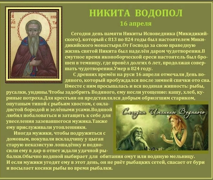Дата в 2022 году: 16 апреля , суббота Другие названия: Никита Ледолом; День Никиты; Угощение водяного; Никитин день; праздник рыболовов Церковное название: Преподобного Никиты Исповедника, игумена Мидикийского Значение: Почтение памяти святого Никиты Исповедника, настоятеля Мидикийского монастыря Традиции: Задабривание водяного; начало сезона рыбалки Народный праздник Никита Водопол отмечается 16 апреля 2016 года (дата по старому стилю – 3 апреля). В православной церкви в этот день почитают святого Никиту Исповедника, настоятеля Мидикийского монастыря. Название «Водопол» связано с началом ледохода и открытием рыбацкого промыслового сезона. История Святой Никита жил в VIII-IX столетиях. Он родился в Вифинийском городе Кесарии в христианской семье. На восьмой день после рождения остался сиротой. Мать умерла, а отец стал монахом. Мальчика воспитывала бабушка. Она привила ему любовь к православной вере. С юных лет Никиту назначили послушником к затворнику Стефану и отдали на службу в храм. По настоянию своего учителя мальчик отправился в Мидикийский монастырь. Через семь лет службы в той обители Никиту рукоположили в священники. Игумен Никифор увидел святость молодого монаха и передал ему управление монастырем. Свое решение настоятель принял по причине тяжелой и долгой болезни, которая не позволяла ему в полной мере исполнять свои обязанности. После смерти преподобного Никифора монахи единодушно избрали новым настоятелем Никиту. Господь наделил его даром чудотворения. Никита вернул речь глухонемому юноше, изгнал бесов из двух женщин, вернул разум сумасшедшему, совершил много других чудес. Когда пришло смутное время иконоборческой ереси, император позвал к себе многих игуменов, в том числе и Никиту. Правитель хотел привлечь их к раскольничеству. Никита устоял сам и не дал своим братьям совершить грех ереси. За это их бросили в темницу. Вторично настоятеля бросили в заточение после того, как не получилось его обманом заставить смириться с иконоборством. Шесть лет он провел в темнице, где продолжал совершать чудеса. В 824 году Никита умер. Традиции и обряды С 16 апреля начинает активно таять снег. Льдины гуляют по рекам. Поэтому в это время внимательно следят, чтобы паводок не нанес беды своим разливом. Предсказать заранее, насколько поднимется вода, можно по расположению гнезд и кротовых нор. Принято ходить на рыбалку. В этот день просыпается водяной. Считается, что после долгого зимнего сна он в плохом настроении. Поэтому его необходимо задобрить гостинцами. Если этого не сделать, то водяной со злости передавит всю рыбу, оставит рыбаков без улова, а сам уплывет в другое место. С полуночи ему несут вино, водку, хлеб, кашу, куриные потроха, в надежде умилостивить дух воды. Приметы Дождливый день предвещает холодную и ненастную весну. Если дует северный ветер, то скоро пойдет дождь. Зацвела мать-и-мачеха – жди беды. | |