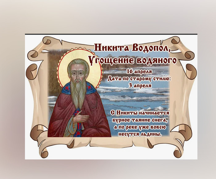 ТЕЛЕГРАММ замедляется.Вероятно скоро его заблокируют.Чтобы не потерять нас и получать оперативно информаци. подпишись на наши каналы в МАХ.Кто еще не подписался В полностью Российской сети МАХ на каналы ВОЕННЫЕ ПЕНСИОНЕРЫ ЗА РОССИЮ И ЕЕ ВООРУЖЕННЫЕ СИЛЫ: Канал для Военных пенсионерах без войны и политики, Военных пенсиях,пенсиях жен военных пенсионеров ,жизни военных пенсионеров и о способах прожить дольше : https://max.ru/voennyepen За Родину .Мы победим.: Оперативная информация О Спецоперации ,политике на канале: https://max.ru/join/aXh9SdoNhgk2rhy901ENolzCyoGLJhMgpon7E6np9n0 СРОЧНО ПОДПИСЫВАЙСЯ и ты будешь в курсе оперативных событий.НЕ пропусти!!! Дата в 2024 году: 16 апреля , вторник Другие названия: Никита Ледолом; День Никиты; Угощение водяного; Никитин день; праздник рыболовов Церковное название: Преподобного Никиты Исповедника, игумена Мидикийского Значение: Почтение памяти святого Никиты Исповедника, настоятеля Мидикийского монастыря Традиции: Задабривание водяного; начало сезона рыбалки Народный праздник Никита Водопол отмечается 16 апреля 2016 года (дата по старому стилю – 3 апреля). В православной церкви в этот день почитают святого Никиту Исповедника, настоятеля Мидикийского монастыря. Название «Водопол» связано с началом ледохода и открытием рыбацкого промыслового сезона. История Святой Никита жил в VIII-IX столетиях. Он родился в Вифинийском городе Кесарии в христианской семье. На восьмой день после рождения остался сиротой. Мать умерла, а отец стал монахом. Мальчика воспитывала бабушка. Она привила ему любовь к православной вере. С юных лет Никиту назначили послушником к затворнику Стефану и отдали на службу в храм. По настоянию своего учителя мальчик отправился в Мидикийский монастырь. Через семь лет службы в той обители Никиту рукоположили в священники. Игумен Никифор увидел святость молодого монаха и передал ему управление монастырем. Свое решение настоятель принял по причине тяжелой и долгой болезни, которая не позволяла ему в полной мере исполнять свои обязанности. После смерти преподобного Никифора монахи единодушно избрали новым настоятелем Никиту. Господь наделил его даром чудотворения. Никита вернул речь глухонемому юноше, изгнал бесов из двух женщин, вернул разум сумасшедшему, совершил много других чудес. Когда пришло смутное время иконоборческой ереси, император позвал к себе многих игуменов, в том числе и Никиту. Правитель хотел привлечь их к раскольничеству. Никита устоял сам и не дал своим братьям совершить грех ереси. За это их бросили в темницу. Вторично настоятеля бросили в заточение после того, как не получилось его обманом заставить смириться с иконоборством. Шесть лет он провел в темнице, где продолжал совершать чудеса. В 824 году Никита умер. Традиции и обряды С 16 апреля начинает активно таять снег. Льдины гуляют по рекам. Поэтому в это время внимательно следят, чтобы паводок не нанес беды своим разливом. Предсказать заранее, насколько поднимется вода, можно по расположению гнезд и кротовых нор. Принято ходить на рыбалку. В этот день просыпается водяной. Считается, что после долгого зимнего сна он в плохом настроении. Поэтому его необходимо задобрить гостинцами. Если этого не сделать, то водяной со злости передавит всю рыбу, оставит рыбаков без улова, а сам уплывет в другое место. С полуночи ему несут вино, водку, хлеб, кашу, курины