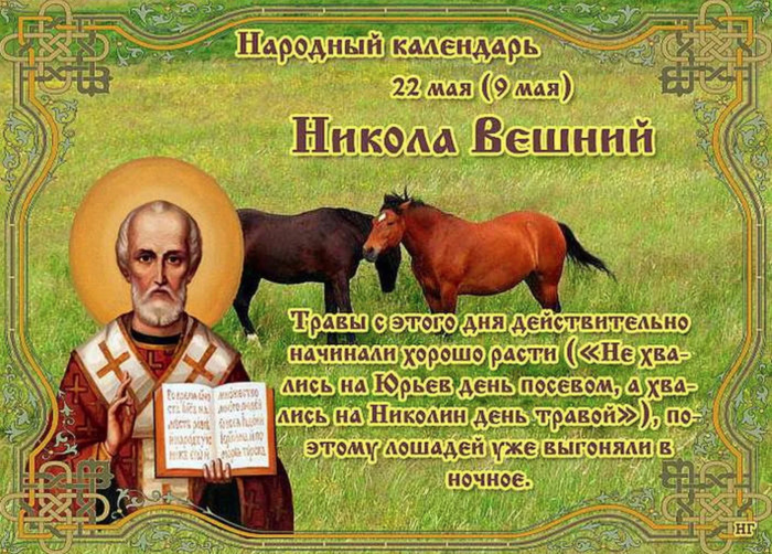 ТЕЛЕГРАММ замедляется.Вероятно скоро его заблокируют.Чтобы не потерять нас и получать оперативно информаци. подпишись на наши каналы в МАХ.Кто еще не подписался В полностью Российской сети МАХ на каналы ВОЕННЫЕ ПЕНСИОНЕРЫ ЗА РОССИЮ И ЕЕ ВООРУЖЕННЫЕ СИЛЫ: Канал для Военных пенсионерах без войны и политики, Военных пенсиях,пенсиях жен военных пенсионеров ,жизни военных пенсионеров и о способах прожить дольше : https://max.ru/voennyepen За Родину .Мы победим.: Оперативная информация О Спецоперации ,политике на канале: https://max.ru/join/aXh9SdoNhgk2rhy901ENolzCyoGLJhMgpon7E6np9n0 СРОЧНО ПОДПИСЫВАЙСЯ и ты будешь в курсе оперативных событий.НЕ пропусти!!! Дата в 2022 году: 22 мая , воскресенье Другие названия: День Николы Вешнего; святой Николай; святой Никола; Никола весенний; Никола теплый; Николин день; Никольщина; Николы; Никола травной; Николай травный; травный день Церковное название: Перенесение мощей святителя и Чудотворца Николая Значение: День памяти о перенесении святых останков святителя Николая из Мир Ликийских в Бар Традиции: Выгон лошадей на пастбище в ночное время; народные гуляния; умывание росой; заговоры на урожай Народный праздник Никола Вешний отмечается 22 мая 2022 года (по старому стилю – 9 мая). По церковному календарю в этот день отмечают перенесение святых останков святителя Николая из Мир Ликийских в Бар. «Вешним» и «Теплым» праздник назвали в противовес Николе Зимнему, Холодному, который отмечается 19 декабря. История Святой Николай – великий угодник Божий, святитель и чудотворец. Он умер в середине IV столетия. Его имя известно во всех уголках земного шара. В честь святого называли и продолжают называть храмы, соборы, монастыри. В России трудно найти город, в котором нет Никольского храма или церкви св. Николая. Мощи святого хранились в Ликийском кафедральном храме, пока в конце VIII столетия в Греции не наступили тяжелые времена. Турки постоянно разоряли ее территории, грабили и сжигали города, оскверняли святые места. Они стремились уничтожить останки святого Николая, которого глубоко чтил весь христианский народ. В 1087 году жители города Бар приехали в Миры специально, чтобы забрать мощи святого. Для этого им пришлось связать охранников-монахов. 8 мая судно прибыло в город, а на следующий день мощи святого торжественно внесли в храм святого Стефана, где они находятся и поныне. Традиции и обряды Святой Николай почитается как покровитель лошадей. В этот день животных выгоняют на ночь на пастбище. К этому сроку трава в поле уже вырастает высокая, и табуны всю ночь резвятся. В старину из этого события устраивали целый праздник, который и сейчас проводят во многих отдаленных областях. Для охраны коней выбирают неженатых парней. Им на ужин готовят специальное угощенье – пироги с кашей. В округе разводят костры. Никто долго не ложится спать. Даже маленьким детям разрешают погулять подольше. Попозже к парням присоединяются девушки. Начинается настоящее молодежное гуляние с песнями под гитары, танцами и разными играми. День Николы Вешнего считается тем самым, когда у мальчиков начинается новая взрослая жизнь. Поэтому в такую ночь никто особо не контролирует молодые и горячие сердца. Утром умываются росой. Считается, что тогда весь год не будет болезней. Также поутру люди выходят на огороды или поля и произносят заговоры, чтобы земля была плодородной, а урожа