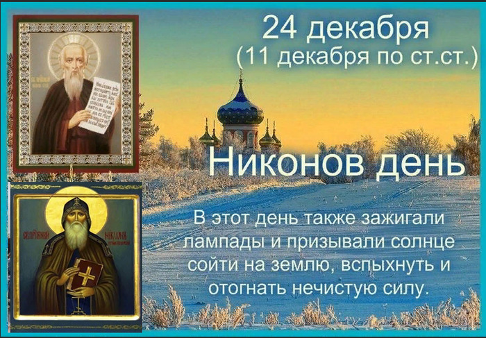 ТЕЛЕГРАММ замедляется.Вероятно скоро его заблокируют.Чтобы не потерять нас и получать оперативно информаци. подпишись на наши каналы в МАХ.Кто еще не подписался В полностью Российской сети МАХ на каналы ВОЕННЫЕ ПЕНСИОНЕРЫ ЗА РОССИЮ И ЕЕ ВООРУЖЕННЫЕ СИЛЫ: Канал для Военных пенсионерах без войны и политики, Военных пенсиях,пенсиях жен военных пенсионеров ,жизни военных пенсионеров и о способах прожить дольше : https://max.ru/voennyepen За Родину .Мы победим.: Оперативная информация О Спецоперации ,политике на канале: https://max.ru/join/aXh9SdoNhgk2rhy901ENolzCyoGLJhMgpon7E6np9n0 СРОЧНО ПОДПИСЫВАЙСЯ и ты будешь в курсе оперативных событий.НЕ пропусти!!! Дата в 2023 году: 24 декабря , воскресенье Другие названия: Никон; Никон Сухой Печерский Церковное название: Преподобного Никона Сухого, Печерского Значение: День памяти святого Никона Традиции: Отгон нечистой силы; загадывание желаний и гадание по ветке яблони; приворот любимой девушки Народный праздник Никонов день отмечается 24 декабря 2023 года (по старому стилю – 11 декабря). В церковном календаре это дата почтения памяти преподобного Никона Печерского, игумена Киево-Печерской лавры. История Сведения о Никоне появились только в момент основания Киево-Печерской лавры. Именно там он стал учеником ее основателя. Никон уже был иноком, и ему было поручено подстригать всех новых монахов, которые приходили в обитель. Когда на постриг пришли княжеский казначей Ефрем и боярин Варлаам, они не стали исключением. Но это навлекло гнев князя Изяслава на всю Лавру. Никон решил удалиться в другую обитель и отправился в город Тмутаракань, где и нашел себе приют. Слава о жизни молчаливого инока быстро распространялась, и к нему стали подтягиваться люди, которые желали посвятить себя такой же жизни. Когда братьев по духу собралось достаточно много, был основан новый монастырь, а Никон вернулся в Киево-Печерскую лавру. В 1068 году князь Изяслав был изгнан с правления своим братом. Никон в это время решил возвратиться в основанный им монастырь. Спустя несколько лет он был избран его игуменом. В 1088 году Никон оставил грешную землю в возрасте 86 лет. Традиции и обряды В Никонов день традиционно славят солнце. Существует поверье, что утреннее солнце и зажженные ночью лампады смогут отогнать нечистую силу, а молитва, произнесенная святому Никону, успокоит душу. В этот день стараются загадать самое заветное желание, отломать ветку яблони и поставить в воду. Если она к Рождеству распустится, то желание исполнится, а если еще и зацветет, то в доме поселится радость. Ветер используют для приворота любимой. Для этого необходимо совершить специальный обряд. Когда вечером из трубы пойдет черный дым, нужно выйти, встать к нему лицом и прочитать заговор. Это привяжет девушку к молодому парню. Приметы Если солнечные лучи в Никонов день к земле тянутся, то жди вьюги. Если от солнца по бокам отсветы идут, то скоро грянут морозы. Если еда в посуде во время готовки через край плескается, то небо вскоре затянут облака. Если воронье кружит и места себе не находит для ночлега, то скоро налетит буря. Если в этот день белки в одном дупле собираются, то вскоре грянут злые морозы. | |