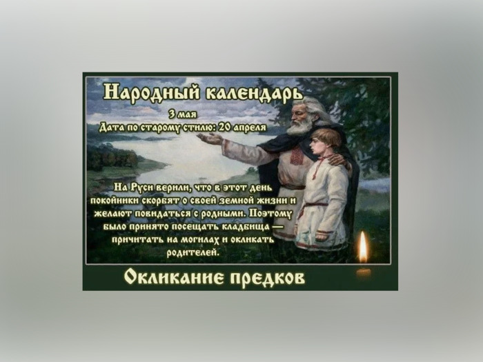 ТЕЛЕГРАММ замедляется.Вероятно скоро его заблокируют.Чтобы не потерять нас и получать оперативно информаци. подпишись на наши каналы в МАХ.Кто еще не подписался В полностью Российской сети МАХ на каналы ВОЕННЫЕ ПЕНСИОНЕРЫ ЗА РОССИЮ И ЕЕ ВООРУЖЕННЫЕ СИЛЫ: Канал для Военных пенсионерах без войны и политики, Военных пенсиях,пенсиях жен военных пенсионеров ,жизни военных пенсионеров и о способах прожить дольше : https://max.ru/voennyepen За Родину .Мы победим.: Оперативная информация О Спецоперации ,политике на канале: https://max.ru/join/aXh9SdoNhgk2rhy901ENolzCyoGLJhMgpon7E6np9n0 СРОЧНО ПОДПИСЫВАЙСЯ и ты будешь в курсе оперативных событий.НЕ пропусти!!! Дата в 2024 году: 3 мая , пятница Другие названия: Окликание родителей; родовые угорья; печной праздник; День Асовъ (предков) Традиции: Обряд окликания умерших предков; поминальная трапеза Народный праздник Окликание предков отмечается 3 мая 2024 года (дата по старому стилю – 20 апреля). Народная легенда гласит, что в этот день души умерших предков, которые тоскуют по земной жизни, могут навестить мир живых. Исчезают преграды между мирами. Но одна все же остается. Чтобы душа близкого человека смогла переступить черту и ступить в мир живых, ее необходимо окликать и причитать. Только так она получит возможность до полуночи погостить здесь. С погоста душа летит вслед за родственником в дом, где смотрит, как живут потомки, что стоит на столе, не голодают ли они. Считается, что души умерших в дни поминовения питаются паром, поэтому специально готовят горячие блюда. После проведенного рядом с близкими людьми на этом свете дня, в 12 часов ночи душа возвращается в свой мир. Традиции и обряды Наши предки всегда чтили и уважали память об умерших. Для них каждый из поминальных дней в году был важен и по-особенному значим. Один из них – Окликание предков. Многие вековые традиции и обряды этого дня сохранились до сегодня. С самого утра, после зажжения поминальных свечей и лампад у икон, старшие в семье женщины идут на кладбище. Там, на могилах умерших родственников, они зовут их, плачут и жалуются, как плохо им живется, как они скучают и горюют. Этот обряд считается ключом, который отпирает вход в этот мир. Если кладбище далеко, можно окликать с порога дома. Главное – делать это искренне и не стесняться окружающих. Для гостей из потустороннего мира накрывают щедрый стол, на котором должны присутствовать кисель, горячие блюда. Поверье гласит, что не один род встает и посещает дом. Поэтому не принято в поминальные дни ставить ноги на поперечины у ножек стола или стульев. Это место для усопших родственников. Для старшей души ставят стул во главе стола. Блюда должны быть по возможности богатыми и сытными. От этого зависит спокойствие души. Она видит, что семья не голодает и не бедствует. Этого ей достаточно, чтобы спокойно вернуться назад. Начинается поминальная трапеза обязательно с трех ложек киселя, каждая из которых – воспоминание о покойном. Чтобы провести душу, как дорогого гостя, выходят на порог. По поверью, в тот миг, когда после полуночи дует ветерок, душа покидает этот мир. По давней традиции принято разводить огонь в печи или камине. Приметы Нельзя ловить рыбу в этот день – это грех. Запрещено ссориться, иначе души предков расстроятся. Рожденный в этот день находится под покровительством своих предков. Если в этот день развестись – 3 года холос