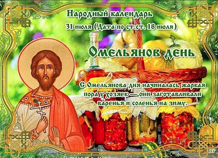 ТЕЛЕГРАММ замедляется.Вероятно скоро его заблокируют.Чтобы не потерять нас и получать оперативно информаци. подпишись на наши каналы в МАХ.Кто еще не подписался В полностью Российской сети МАХ на каналы ВОЕННЫЕ ПЕНСИОНЕРЫ ЗА РОССИЮ И ЕЕ ВООРУЖЕННЫЕ СИЛЫ: Канал для Военных пенсионерах без войны и политики, Военных пенсиях,пенсиях жен военных пенсионеров ,жизни военных пенсионеров и о способах прожить дольше : https://max.ru/voennyepen За Родину .Мы победим.: Оперативная информация О Спецоперации ,политике на канале: https://max.ru/join/aXh9SdoNhgk2rhy901ENolzCyoGLJhMgpon7E6np9n0 СРОЧНО ПОДПИСЫВАЙСЯ и ты будешь в курсе оперативных событий.НЕ пропусти!!! Дата в 2022 году: 31 июля , воскресенье Другие названия: Омельян; День Омельяна; Емельян; День Емельяна; Емельянов день Церковное название: Мученика Емилиана Доростольского Значение: Почтение памяти мученика Емилиана Доростольского Традиции: Завершение жатвы; походы в баню Народный праздник Омельянов день отмечается 31 июля 2022 года (дата по старому стилю – 18 июля). Православная церковь этого числа чтит память мученика Емилиана Доростольского. История Емилиан был простым рабом уважаемого сановника города Доростола Мизийской области. В 363 году в город прибыл игемон с приказом императора Юлиана Отступника истребить всех христиан. Емилиан сильно разозлился. Он проник ночью в языческий храм, разбил идолов и опрокинул алтари. Затем незаметным отправился домой. Когда он узнал, что за его преступление избивают невинного старца, то бросился на место истязания и признался. Емилиана долго избивали, после чего отправили на костер. Но огонь не причинил ему вреда. Зато языки пламени разлетались далеко и палили язычников. Как только огонь угас, Емилиан лег на горячие угли, помолился и предал душу Господу. Традиции и обряды В этот день люди часто завершают жатву. По окончании работ они располагают орудия труда кругом на полосе. После того как священник отслужит молебен, он окропляет их святой водой. В Омельянов день люди ходят в баню. Париться в ней нужно с соблюдением определенных правил, иначе легко обидеть или рассердить банника – духа, который там обитает. Он может швырнуть камнем или окатить кипятком того, кто ему не понравился. Чтобы задобрить банника, в помещение нужно входить с легким поклоном, без креста на шее, оставлять для него мыло, полотенце, веник и воду. Саму баню следует содержать в постоянной чистоте и стараться помыться в первые два пара. Желательно не находиться в ней одному вечером или ночью. Приметы Какая погода в этот день, такой будет большая часть осени. Если раскаты грома глухие, то дождь будет недолгим. Гулкие раскаты – к ливню. Беспрерывный грохот в небе – к граду. Грохот грома звучит долго и с накатом – к непогоде; отрывисто и быстро – к ясной погоде. Жаркий день – к морозному декабрю. Ель покрыта шишками только на верхушке – раньше января морозов не будет. Если на верхушке березы листья пожелтели, а остальная крона зеленая, то осень наступит раньше своего срока. Увидеть банного духа – к беде. Вид у него устрашающий: длинные когти, которыми он легко может задушить человека, тело покрыто шерстью и волосами. | |