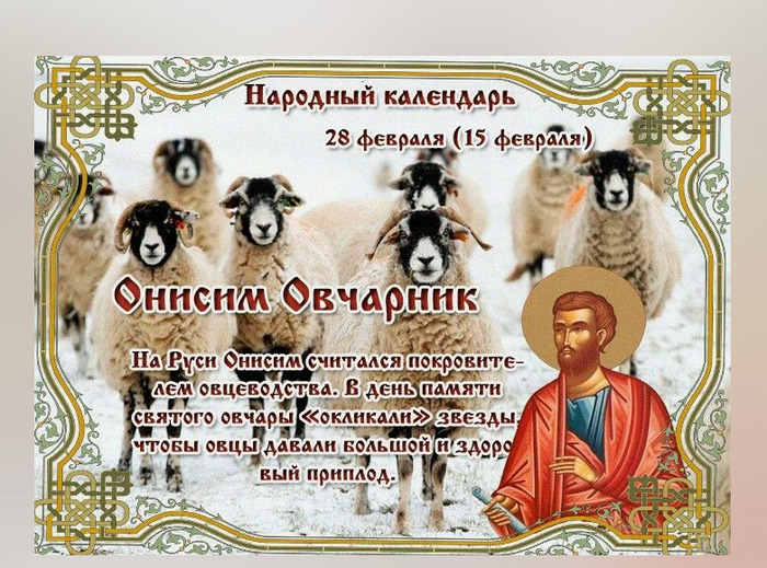 ТЕЛЕГРАММ замедляется.Вероятно скоро его заблокируют.Чтобы не потерять нас и получать оперативно информаци. подпишись на наши каналы в МАХ.Кто еще не подписался В полностью Российской сети МАХ на каналы ВОЕННЫЕ ПЕНСИОНЕРЫ ЗА РОССИЮ И ЕЕ ВООРУЖЕННЫЕ СИЛЫ: Канал для Военных пенсионерах без войны и политики, Военных пенсиях,пенсиях жен военных пенсионеров ,жизни военных пенсионеров и о способах прожить дольше : https://max.ru/voennyepen За Родину .Мы победим.: Оперативная информация О Спецоперации ,политике на канале: https://max.ru/join/aXh9SdoNhgk2rhy901ENolzCyoGLJhMgpon7E6np9n0 СРОЧНО ПОДПИСЫВАЙСЯ и ты будешь в курсе оперативных событий.НЕ пропусти!!! Дата в 2024 году: 28 февраля , среда Другие названия: Онисим; Зимобор; Анисим-зорник; Онисим-овчарник; Овчарницы; Окличка; Семенное Церковное название: Апостола от 70-ти Онисима Значение: Почтение памяти святого Онисима Традиции: Проводы зимы; окликание звезд для плодородия овец; закалка семян и пряжи на морозе Народный праздник Онисим Овчар отмечается 28 февраля 2024 года (дата по старому стилю – 15 февраля). В православном церковном календаре это день почтения памяти апостола от 70-ти Онисима. История В молодости святой Онисим жил в Фригийской области в городе Колоссах. Был рабом знатного христианина Филимона. Впав в немилость хозяина и опасаясь его гнева, пустился в бега. В Риме попал в тюрьму. Там судьба свела его с апостолом Павлом. После этой встречи он открыл для себя христианскую веру и принял Святое Крещение. Апостол Павел знал лично Филимона. Он написал ему письмо, в котором попросил простить беглого раба. Затем отправил Онисима к хозяину. Филимон простил его и отпустил на волю. Жизнь на свободе Онисим посвятил службе апостолам, а после их смерти стал проповедником. Побывал во многих местах. В глубокой старости его назначили епископом города Ефес. При импраторе Траяне, в 109 году, святого Онисима арестовали. После длительных истязаний его приговорили к казни за твердое исповедование христианской веры. Традиции и обряды На Онисима Овчара зима лютует и сердится, что вышел ее срок. С этого дня начинаются проводы зимы. Молодежь устраивает гуляния и развлечения. У славян святой Онисим считается покровителем овцеводства. С давних пор существует обряд «оклика звезд». Овчары просят небесные светила подарить их овцам большое и здоровое потомство. Проводят обряд «семенное». Разные семена выносят на три дня на мороз, затем прячут до посева. Считается, что после такой закалки они дадут хорошие всходы. Мастерицы в этот день «зарнят пряжу» – выбирают лучший моток из новой пряжи и оставляют утром на улице. После проведения такого обряда она становится более крепкой. Приметы Если сосульки висят большие, значит, весна долго продлится. Поднявшийся уровень воды в реке предсказывает хорошую страду. Онисим Овчар – удачный день для гаданий. | |