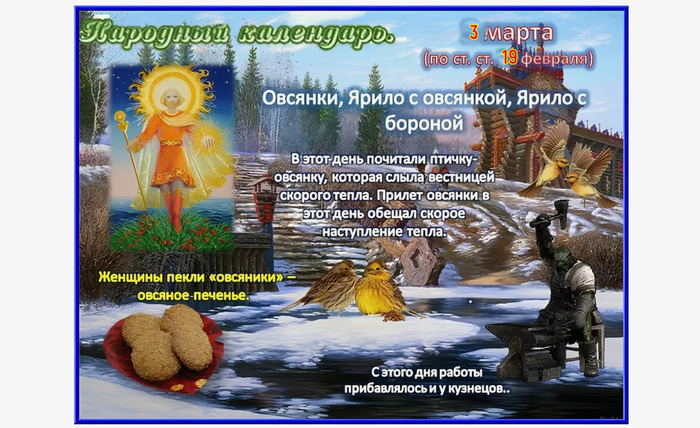 ТЕЛЕГРАММ замедляется.Вероятно скоро его заблокируют.Чтобы не потерять нас и получать оперативно информаци. подпишись на наши каналы в МАХ.Кто еще не подписался В полностью Российской сети МАХ на каналы ВОЕННЫЕ ПЕНСИОНЕРЫ ЗА РОССИЮ И ЕЕ ВООРУЖЕННЫЕ СИЛЫ: Канал для Военных пенсионерах без войны и политики, Военных пенсиях,пенсиях жен военных пенсионеров ,жизни военных пенсионеров и о способах прожить дольше : https://max.ru/voennyepen За Родину .Мы победим.: Оперативная информация О Спецоперации ,политике на канале: https://max.ru/join/aXh9SdoNhgk2rhy901ENolzCyoGLJhMgpon7E6np9n0 СРОЧНО ПОДПИСЫВАЙСЯ и ты будешь в курсе оперативных событий.НЕ пропусти!!! В Телеграмм создана группа " Военные пенсионеры за Россию и ее ВС. Мы победим". У кого есть Телеграмм просим вступить в нее. Там много интересного, срочного, очень оперативная информация, а также чего нельзя помещать в ОДНОКЛАССНИКАХ и на сайте. Вступить можно по ссылке: Военные пенсионеры за Россию и ее ВС. Мы победим "https://t.me/voenpenszaRossiu" Очень большая просьба НЕ ОТПИСЫВАТЬСЯ ОТ КАНАЛА, Канал работает в тестовом режиме. Мы стараемся понять, что Вам будет интересно читать и как работать дальше. Пишите, что бы Вам хотелось читать в ТЕЛЕГРАММ. Хоть в любой теме на сайте, хоть в Телеграмм. Чтобы не раздражали уведомления их можно ОТКЛЮЧИТЬ. Кого раздражают уведомления в Телеграмм их можно отключить. Отключить уведомления можно нажав на надпись ОТКЛЮЧИТЬ УВЕДОМЛЕНИЯ внизу Дата в 2025 году: 3 марта , понедельник Другие названия: Овсянка; Покинь сани, Ярило с бороной, Ярило с овсянкой Значение: Посвящен богу солнца Яриле Традиции: Проверка сельскохозяйственного инвентаря на исправность, ремонт; выпечка овсяного печенья; молодежные гуляния и вечерние посиделки Народный праздник Овсянки (Ярило с бороной, Ярило с овсянкой) отмечается 3 марта 2025 года (дата по старому стилю – 18 февраля). Этот день посвящен древнему мифологическому персонажу Яриле – языческому славянскому богу солнца, весны, плодородия, буйной силы и тепла. Название праздника «Овсянки» пошло от одноименной небольшой птички – символа начала весны. Традиции и обряды На Овсянки хозяева проверяют соху, борону и другой сельскохозяйственный инвентарь на готовность к началу нового сезона полевых работ. При необходимости чинят, настраивают, заменяют детали. Если самостоятельно отремонтировать инструмент не получается, то обращаются к кузнецам. В этот день почитают птицу овсянку – предвестницу скорого тепла. В честь нее пекут булочки-овсянки и овсяное печенье. Ими угощают родных, друзей и саму птичку. Считается, если овсянке понравится угощение, то она быстрее приведет за собой солнечное тепло, и наступит долгожданная после холодной зимы весна. Молодежь устраивает в этот праздник гуляния и вечерние посиделки. Приметы Если на земле лежит много снега, то урожай хлеба будет богатым. Если много воды, значит, будет много травы, и соответственно, сена. Плывущие высоко в небе облака предвещают плохую погоду. Туман целый день – лето будет холодным и дождливым. Багряная заря – жди снега. Деревья трещат – к морозам, почернели – к потеплению. Если птичка овсянка запела, значит, зима закончилась, жди скорого тепла. | |