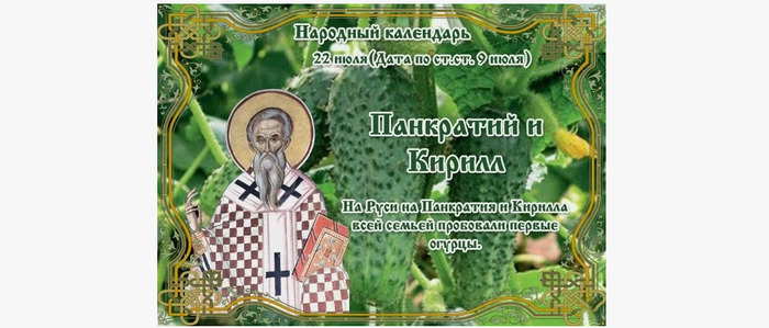 ТЕЛЕГРАММ замедляется.Вероятно скоро его заблокируют.Чтобы не потерять нас и получать оперативно информаци. подпишись на наши каналы в МАХ.Кто еще не подписался В полностью Российской сети МАХ на каналы ВОЕННЫЕ ПЕНСИОНЕРЫ ЗА РОССИЮ И ЕЕ ВООРУЖЕННЫЕ СИЛЫ: Канал для Военных пенсионерах без войны и политики, Военных пенсиях,пенсиях жен военных пенсионеров ,жизни военных пенсионеров и о способах прожить дольше : https://max.ru/voennyepen За Родину .Мы победим.: Оперативная информация О Спецоперации ,политике на канале: https://max.ru/join/aXh9SdoNhgk2rhy901ENolzCyoGLJhMgpon7E6np9n0 СРОЧНО ПОДПИСЫВАЙСЯ и ты будешь в курсе оперативных событий.НЕ пропусти!!! В Телеграмм создана группа " Военные пенсионеры за Россию и ее ВС. Мы победим". У кого есть Телеграмм просим вступить в нее. Там много интересного, срочного, очень оперативная информация, а также чего нельзя помещать в ОДНОКЛАССНИКАХ и на сайте. Вступить можно по ссылке: Военные пенсионеры за Россию и ее ВС. Мы победим "https://t.me/voenpenszaRossiu" Очень большая просьба НЕ ОТПИСЫВАТЬСЯ ОТ КАНАЛА, Канал работает в тестовом режиме. Мы стараемся понять, что Вам будет интересно читать и как работать дальше. Пишите, что бы Вам хотелось читать в ТЕЛЕГРАММ. Хоть в любой теме на сайте, хоть в Телеграмм. Чтобы не раздражали уведомления их можно ОТКЛЮЧИТЬ. Кого раздражают уведомления в Телеграмм их можно отключить. Отключить уведомления можно нажав на надпись ОТКЛЮЧИТЬ УВЕДОМЛЕНИЯ внизу Дата в 2025 году: 22 июля , вторник Другие названия: День Панкрата; Панкрат; День Кирилла; Кирилл; Панкрат и Кирилл; ягодник Церковное название: Священномученика Панкратия, епископа Тавроменийского; священномученика Кирилла, епископа Гортинского Значение: Почтение памяти епископов Панкратия Тавроменийского и Кирилла Гортинского Традиции: Сбор огурцов Народный праздник Панкратий и Кирилл отмечается 22 июля 2025 года (дата по старому стилю – 9 июля). В церковном календаре это день почитания двух священномучеников – епископов Панкратия Тавроменийского и Кирилла Гортинского. История Панкратий жил в I веке. Был родом из Антиохии. Вместе с родителями отправился в Иерусалим, когда там был Иисус, чтобы получить его благословение. Там он познакомился с апостолом Петром. После смерти родителей юноша обосновался в одной из пещер Понтийского хребта, где предавался размышлениям и молитвам. Там его нашел апостол Петр и позвал с собой. Вскоре они оказались в Киликии. Там их встретил апостол Павел. Петр и Павел назначили Панкратия епископом Тавромении. За многие годы его служения почти все горожане и многие жители окрестных селений приняли христианство. За это язычники озлобились на епископа, напали на него и убили. Так Панкратий принял мученическую смерть в конце I века. Кирилл жил в III веке. Когда императоры Диоклетиан и Максимиан начали преследовать христиан за вероисповедание, его арестовали с другими братьями по вере и бросили в темницу ждать суда. По воле Всевышнего Кирилл чудесным образом оказался на свободе и по указу Господа отправился в Рим. Там он проповедью вдохновил православных не падать духом и не сдаваться. Когда гонения вновь настигли Кирилла, он с той же миссией отправился в Иерусалим. По дороге ему было видение, которое указало на остров Крит. Там его избрали епископом за красноречие и непоколебимую веру в Бога. Десятилетия священнослужитель неустанно наставл