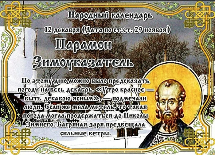 ТЕЛЕГРАММ замедляется.Вероятно скоро его заблокируют.Чтобы не потерять нас и получать оперативно информаци. подпишись на наши каналы в МАХ.Кто еще не подписался В полностью Российской сети МАХ на каналы ВОЕННЫЕ ПЕНСИОНЕРЫ ЗА РОССИЮ И ЕЕ ВООРУЖЕННЫЕ СИЛЫ: Канал для Военных пенсионерах без войны и политики, Военных пенсиях,пенсиях жен военных пенсионеров ,жизни военных пенсионеров и о способах прожить дольше : https://max.ru/voennyepen За Родину .Мы победим.: Оперативная информация О Спецоперации ,политике на канале: https://max.ru/join/aXh9SdoNhgk2rhy901ENolzCyoGLJhMgpon7E6np9n0 СРОЧНО ПОДПИСЫВАЙСЯ и ты будешь в курсе оперативных событий.НЕ пропусти!!! Дата в 2022 году: 12 декабря , понедельник Другие названия: Парамонов день; Парамон-зорник; Парамон Церковное название: Мученика Парамона Вифинского и с ним 370-ти мучеников Значение: День памяти святого Парамона Традиции: Уборка снега с крыш Народный праздник Парамон Зимоуказатель отмечается 12 декабря 2022 года (по старому стилю – 29 ноября). В православном календаре это дата почтения памяти мученика Парамона Вифинского. В народе праздник назвали «зимоуказателем» за то, что по этому дню судят о погоде, которая будет стоять весь декабрь. История Молодой человек по имени Парамон жил в начале III столетия, при императоре Декии. В восточных областях, которыми правил князь Вифинский Аквиан, язычниками было схвачено большое число христиан. Их заточили в темницу и предавали всевозможным истязаниям, заставляли отречься от веры в Христа, принеся жертву идолам. Об этом узнал местный житель, которого звали Парамон. Он был очень возмущен поведением правителя, который позволял себе так жестоко обращаться с людьми, пусть и другой веры. Парамон прибыл в темницу, где держали заключенных и признал себя христианином, верующим в Истинного Бога. После этого он принял смерть с остальными мучениками. Традиции и обряды В этот народный праздник принято убирать снег с крыш, если он есть. Для этого используют только веник или метлу. Лопатами убирать нельзя, иначе крыша может проржаветь и продырявиться. К этому дню зима обычно уже вступает в свои права, и вокруг царит батюшка-мороз. По поверью, на Парамона сама госпожа Зима надевает медвежью шкуру и выходит к людям. Она гуляет по улицам и крышам, стучит в окна и печные трубы, чтобы разбудить заспавшихся хозяек. Зимой утром хоть и тяжело вставать, но нужно. Дел много с самого утра – печь растопить, кашу приготовить, домашних разбудить и горячим накормить. Приметы Если на Парамона Зимоуказателя метет метель, значит, еще неделю будет такая погода. Заря окрашена в багряный цвет – скоро начнутся сильные ветра. Если снега много – следующий год будет непременно урожайным. Если до Парамона не было снега, то это означает, что ближайшие семь дней будут сильные морозы. | |
