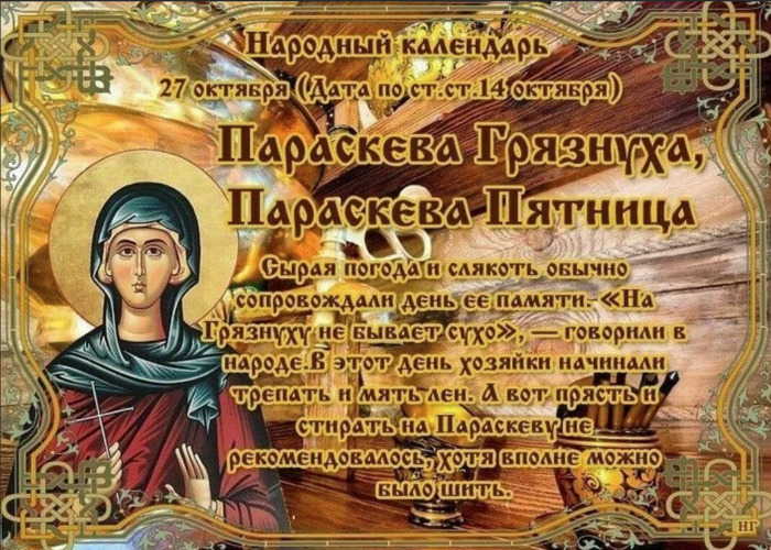 ТЕЛЕГРАММ замедляется.Вероятно скоро его заблокируют.Чтобы не потерять нас и получать оперативно информаци. подпишись на наши каналы в МАХ.Кто еще не подписался В полностью Российской сети МАХ на каналы ВОЕННЫЕ ПЕНСИОНЕРЫ ЗА РОССИЮ И ЕЕ ВООРУЖЕННЫЕ СИЛЫ: Канал для Военных пенсионерах без войны и политики, Военных пенсиях,пенсиях жен военных пенсионеров ,жизни военных пенсионеров и о способах прожить дольше : https://max.ru/voennyepen За Родину .Мы победим.: Оперативная информация О Спецоперации ,политике на канале: https://max.ru/join/aXh9SdoNhgk2rhy901ENolzCyoGLJhMgpon7E6np9n0 СРОЧНО ПОДПИСЫВАЙСЯ и ты будешь в курсе оперативных событий.НЕ пропусти!!! Дата в 2022 году: 27 октября , четверг Другие названия: Параскева, День Параскевы, Порошиха, Льняниха, Льняница, Трепальница, Пряха, Прасковья, Параскева Пятница (если выпадает на пятницу) Церковное название: Преподобной Параскевы-Петки Значение: Почтение памяти святой Параскевы Традиции: Трепание льна; демонстрация женщинами своих лучших одежд; запрещено стирать и прясть пряжу 27 октября 2022 года (дата по старому стилю – 14 октября) православные верующие чтят память святой преподобной Параскевы Сербской. Народное название праздника – Параскева Грязниха появилось из-за осенней грязи и непогоды. Иногда его именуют Порошихой, по причине выпадающего легкого снежка на уже замерзшую землю или Трепальницей, так как в это время начинали трепать лен. Святая Параскева (Петка) появилась на свет в доме богатых родителей в селении Епиат (Сербия). Родители очень часто посещали церковь, исполняли все заповеди и раздавали милостыню нищим и обездоленным. Параскева тоже очень любила бывать в церкви. На одной из Божественных Литургий она услышала слова Евангельские о том, что каждый может последовать за Господом Богом, если захочет. Они настолько запали в душу Петке, что девушка решила жить так, как учит Иисус. После смерти родителей она вместе с братом покинула отчий дом и отправилась в Царьград (Константинополь), где поклонилась святыням. Затем устремилась в Иорданскую пустыню, где и прожила до глубокой старости. Однажды ночью во время молитвы к ней явился Ангел и повелел вернуться домой. Там через два года она и умерла. Традиции и обряды На Параскеву Грязниху нельзя стирать и прясть пряжу, а можно только шить, мять и трепать лен. Если праздник выпадает на пятницу, то в этот день лучше много не смеяться. Согласно поверью, тогда в старости придется много слез лить. После молитвы женщины традиционно наряжаются в свои лучшие одежды и выходят на прогулку, демонстрируя тем самым свое умение в рукоделии. Приметы Параскева является покровителем женщин, ожидающих приплод. Беременные верили в примету, что если расчесать волосы в пятницу, то когда придет время рожать, святая не поможет. Если в этот день грязи пуще прежнего (копыто лошади полностью погружается в грязь), то выпавший снег не растает, а зима наступит через 28 дней (4 недели). | |