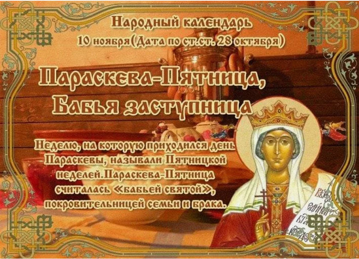 ТЕЛЕГРАММ замедляется.Вероятно скоро его заблокируют.Чтобы не потерять нас и получать оперативно информаци. подпишись на наши каналы в МАХ.Кто еще не подписался В полностью Российской сети МАХ на каналы ВОЕННЫЕ ПЕНСИОНЕРЫ ЗА РОССИЮ И ЕЕ ВООРУЖЕННЫЕ СИЛЫ: Канал для Военных пенсионерах без войны и политики, Военных пенсиях,пенсиях жен военных пенсионеров ,жизни военных пенсионеров и о способах прожить дольше : https://max.ru/voennyepen За Родину .Мы победим.: Оперативная информация О Спецоперации ,политике на канале: https://max.ru/join/aXh9SdoNhgk2rhy901ENolzCyoGLJhMgpon7E6np9n0 СРОЧНО ПОДПИСЫВАЙСЯ и ты будешь в курсе оперативных событий.НЕ пропусти!!! Дата в 2023 году: 10 ноября , пятница Другие названия: Параскева Пятница, Льняные смотрины, Льняница, Трепальницы, Бабья заступница, Параскева и Ненила Церковное название: Великомученицы Параскевы, нареченной Пятница Значение: Почтение памяти святой Параскевы Традиции: Осмотр и утепление изб; льняные смотрины Народный праздник Параскевы Льняницы отмечается 10 ноября 2023 года (по старому стилю – 28 октября). В церковном календаре это дата почтения памяти святой великомученицы Параскевы. В народе ее прозвали Льняницей, так как в этот праздник женщины хвастаются своим льном. Также святую мученицу называют Параскевой Пятницей, поскольку она родилась именно в этот день. История В III веке во времена правления Диоклетиана жила богатая сенаторская семья. Она была бездетной, но, проповедуя христианскую веру, супруги ежедневно читали молитвы Господу Богу о даровании им дитя. Особенно молились в пятницу – в день страданий Сына Божьего. Их просьбы были услышаны, и у них родилась дочь, которую нарекли Параскевой (в переводе с греческого «пятница»). Живя в благочестии и вере, девушка не обращала внимания на сватовство молодых людей, посвятила всю себя Господу Богу, а все свои богатства тратила на одежду и пропитание для нищих. После мучительной смерти от рук императора Диоклетиана она завоевала еще большую любовь и уважение среди народа. В настоящее время считается, что лик святой Параскевы охраняет семейное счастье и благополучие. Кроме того, она может излечить различные болезни души и тела. Традиции и обряды В этот день осматривают и утепляют избы, а поголовья скота загоняют в зимние стойла. Считается, что Параскева покровительствует полям и домашнему скоту. В связи с этим в церковь приносят различные выращенные плоды, которые после освящения хранят в домах до конца года. Если начинается падеж домашнего скота, то первым делом воздают молитвы святой Параскеве. Женщины выносят за ворота домов вытрепанный лен, льняные холсты и, раскладывая их, хвастаются перед соседями. Таким образом проводятся льняные смотрины. Приметы Если выпал снег, а вишня сбросила еще не все листья, то он быстро растает. В день Параскевы Льняницы, чтобы не накликать беду, запрещается делать работу, связанную с водой. Исключение составляет болезнь ребенка. В таком случае его необходимо умыть в источнике. Получившийся после вытрепки первый лен необходимо освятить в церкви. Беременной женщине запрещается в этот день давать в долг деньги. Считается, что таким образом она отдает в чужие руки судьбу своего будущего ребенка. Сайт существует только благодаря Вам ,посетители и пользователи сайта. Кто хочет помочь сайту добровольно, перечислите деньги в сумме от 1 рубля н