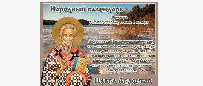 ТЕЛЕГРАММ замедляется.Вероятно скоро его заблокируют.Чтобы не потерять нас и получать оперативно информаци. подпишись на наши каналы в МАХ.Кто еще не подписался В полностью Российской сети МАХ на каналы ВОЕННЫЕ ПЕНСИОНЕРЫ ЗА РОССИЮ И ЕЕ ВООРУЖЕННЫЕ СИЛЫ: Канал для Военных пенсионерах без войны и политики, Военных пенсиях,пенсиях жен военных пенсионеров ,жизни военных пенсионеров и о способах прожить дольше : https://max.ru/voennyepen За Родину .Мы победим.: Оперативная информация О Спецоперации ,политике на канале: https://max.ru/join/aXh9SdoNhgk2rhy901ENolzCyoGLJhMgpon7E6np9n0 СРОЧНО ПОДПИСЫВАЙСЯ и ты будешь в курсе оперативных событий.НЕ пропусти!!! Удивляюсь я : пенсию получили ,на сайт ходит много народу и жалко 1 рубля, что бы сайт существовал? Дело идет к закрытию сайта,2-х групп на ОДНОКЛАССНИКАХ и запасного сайта. Основной массе военпенсов как всегда Все равно. Как боялись поддержать обращения к Власти да и всего военпенсы боятся. Бог Вам судья Сбор добровольных пожертвований идет очень медленно. Дело идет к закрытию сайта. Нам важна любая помощь .Для продолжения работы сайта необходимы деньги. Если не сможем собрать 16800 руб до 15 декабря придется закрыть сайт.Кто хочет помочь сайту добровольно, перечислите деньги в сумме от 1 рубля на карту 4006800071005382 Деньги перечислить можно через мобильное приложение Вашего банка , можно обратиться в банк или через банкомат .Информация о количестве собранных денег будет публиковаться регулярно .Как насобираем необходимую сумму сбор пожертвований для оплаты сайта будет прекращен . Дата в 2024 году: 19 ноября , вторник Другие названия: Павел, Павел Исповедник Церковное название: Святителя Павла, исповедника, патриарха Константинопольского Значение: Почтение памяти святого Павла Традиции: Подготовка к зимней рыбалке Народный праздник Павел Ледостав отмечается 19 ноября 2024 года (по старому стилю – 6 ноября). В церковном календаре это дата почтения памяти святителя Павла, исповедника, патриарха Константинопольского. В простонародье его прозвали Ледоставом, так как к этому дню мороз сковывал льдом реки и озера. История Святитель Павел проживал в Малой Азии в городе Прусиаде. Когда патриарх Александр умирал, его спросили о том, кого назначить на Константинопольскую кафедру. Он указал на Павла и диакона Македония. Во время Собора разгорелся спор о новом патриархе, но большинством голосов был избран Павел. В то время правящий император Констанций был в другом городе и не присутствовал во время обсуждения кандидатуры. Вернувшись, он высказал свое недовольство тем, что патриарха избрали без его согласия. Павел был низложен и изгнан. Святителем назначили арианина Евсевия. После смерти Евсевия Павел вернулся в Константинополь. Паства приняла его, но император Констанций повторно изгнал. Тогда за него заступился западный соимператор, написав владыке грозное письмо. Это подействовало, и Павел был возведен на патриарший престол. Вскоре западного императора, защитника христиан, предательски убили, а Павла снова изгнали. Сосланный в Армению (город Кукуз), он не перестал проповедовать. В 350 году, во время совершения Божественной литургии, на него напали ариане и задушили омофором. Традиции и обряды В этот день рыбаки готовятся к зимней подледной рыбалке. Они достают и проверяют снасти. Если находят прорехи, то чинят их. Приметы Если лед гладкий
