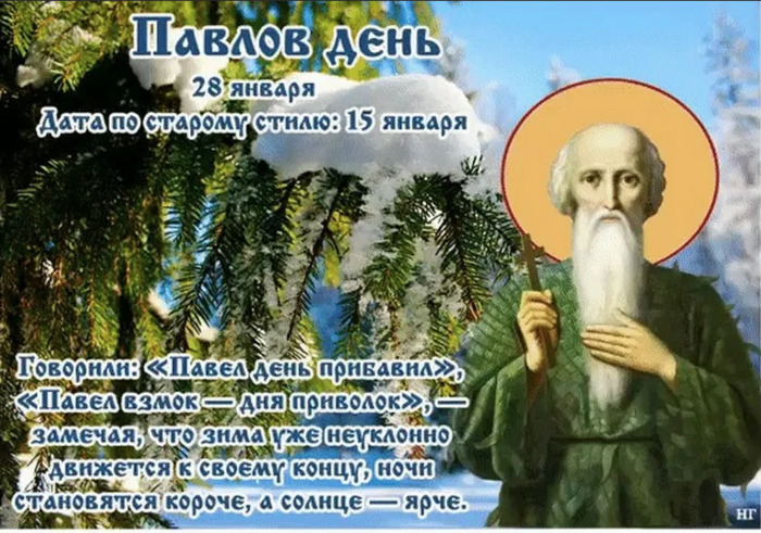 ТЕЛЕГРАММ замедляется.Вероятно скоро его заблокируют.Чтобы не потерять нас и получать оперативно информаци. подпишись на наши каналы в МАХ.Кто еще не подписался В полностью Российской сети МАХ на каналы ВОЕННЫЕ ПЕНСИОНЕРЫ ЗА РОССИЮ И ЕЕ ВООРУЖЕННЫЕ СИЛЫ: Канал для Военных пенсионерах без войны и политики, Военных пенсиях,пенсиях жен военных пенсионеров ,жизни военных пенсионеров и о способах прожить дольше : https://max.ru/voennyepen За Родину .Мы победим.: Оперативная информация О Спецоперации ,политике на канале: https://max.ru/join/aXh9SdoNhgk2rhy901ENolzCyoGLJhMgpon7E6np9n0 СРОЧНО ПОДПИСЫВАЙСЯ и ты будешь в курсе оперативных событий.НЕ пропусти!!! Дата в 2022 году: 28 января , пятница Другие названия: День колдунов, Павел Фивейский, Отдание, День Отдания или Видения Церковное название: Преподобных Павла Фивейского и Иоанна Кущника Значение: День памяти святого Павла Традиции: Обряды от сглаза и порчи; задабривание домового Народный праздник Павлов день отмечается 28 января 2022 года (по старому стилю – 15 января). В церковном православном календаре это дата почтения памяти преподобного Павла Фивейского, первого христианского монаха. В народе этот праздник называют еще Днем колдунов. Считается, что обладающие колдовскими знаниями именно в этот день передают их своим ученикам. А простые люди страдают от этого, так как молодые и неопытные ученики тренируются на них. История Павел родился в период правления Декия в Фиваде (Египет). Он рано стал сиротой и испытал множество бед от своего родственника, который желал получить его наследство. Когда начались гонения на христиан, Павел узнал, что родственник хочет сообщить о его вере правителю и вынужден был покинуть город. Он отправился в пустыню, где поселился у подножия горы в пещере и прожил там 91 год. Пищу ему приносил ворон. Павел непрестанно молился. Ни одна живая душа не знала о нем. И вот однажды его имя было открыто святому Антонию, который также поселился в этой пустыне. Антоний нашел Павла и между ними завязался разговор. Павел рассказал о своей скорой кончине и велел похоронить его согласно христианским традициям. Во время молитвы он умер. Антоний похоронил его в могиле, которую вырыли два льва, а его одежду унес с собой. Традиции и обряды Люди боятся этого праздника и стараются защитить себя любыми способами: плюют через левое плечо, молятся, стучат по дереву, проводят обряды от сглаза и порчи. В этот день необходимо задобрить домового. Во время обеда его надо похвалить и поставить ему рюмку спиртного напитка (вина или водки). Приметы Если в Павлов день ветер подул, то летом будут часто идти дожди. Если вороны раскаркались, то тепло не за горами. Синицы пытаются укрыться поближе к дому – готовься к лютым морозам. Ночное небо усыпали яркие звезды – к хорошему урожаю льна. Если тучи на севере видны, то мороз усилится. Звезды тускло мерцают – жди тепла, а если ярко загорелись – холода. Если на Павла повалил снег, то жди морозов. Если вороны начали прятаться, то скоро ударят морозы. Если воробьи на деревьях затихли, то жди снегопада. Снегири защебетали – к изменению погоды. | |