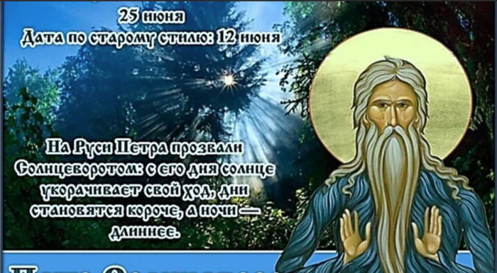 ТЕЛЕГРАММ замедляется.Вероятно скоро его заблокируют.Чтобы не потерять нас и получать оперативно информаци. подпишись на наши каналы в МАХ.Кто еще не подписался В полностью Российской сети МАХ на каналы ВОЕННЫЕ ПЕНСИОНЕРЫ ЗА РОССИЮ И ЕЕ ВООРУЖЕННЫЕ СИЛЫ: Канал для Военных пенсионерах без войны и политики, Военных пенсиях,пенсиях жен военных пенсионеров ,жизни военных пенсионеров и о способах прожить дольше : https://max.ru/voennyepen За Родину .Мы победим.: Оперативная информация О Спецоперации ,политике на канале: https://max.ru/join/aXh9SdoNhgk2rhy901ENolzCyoGLJhMgpon7E6np9n0 СРОЧНО ПОДПИСЫВАЙСЯ и ты будешь в курсе оперативных событий.НЕ пропусти!!! Дата в 2022 году: 25 июня , суббота Другие названия: Петр; Петров день; Петр-капустник; капустник; запоздалый капустник; Петр-рыболов; День Петра Афонского; Петр Афонский; День Петра Переворота; Петр-поворот Церковное название: Преподобного Петра Афонского Значение: День памяти преподобного Петра Афонского Традиции: Рыбалка; приготовление блюд из рыбы; высадка рассады капусты; посев зерновых Народный праздник Петр Солнцеворот отмечается 25 июня 2022 года (по старому стилю – 12 июня). По церковному календарю это дата почтения памяти преподобного Петра Афонского. Название праздника «Солнцеворот» связано с тем, что световой день в этот период укорачивается, а ночь увеличивается. Происходит это по причине поворота небесного светила на зиму, а лета – на жару. История Петр родился в Греции. Служил начальником императорского войска в Константинополе. Во время войны с сирийцами его схватили и удерживали в кандалах в крепости Аравийского города Самары, где он пробыл долгое время. В плену Петр переосмыслил свою жизнь и решил, что это Бог наказал его. Ведь долгое время он помышлял оставить мирскую жизнь и стать монахом, но все никак не решался на это. Когда он пришел к такому выводу, то стал поститься. Молился святому Николаю Чудотворцу и Симеону Богоприимцу, просил у них покровительства. Святые помогли ему покинуть темницу и дойти до границы Греции. По приходу в Рим сам Папа постриг его в монахи. Петр жил при нем до той поры, пока не познал все учение иноческой жизни. Однажды ему во сне явилась Богородица и указала Святую Гору Афон как место, где он должен провести всю оставшуюся жизнь. В 682 году Петр приплыл туда. Первое время он боролся с нападками бесов. 7 лет они осаждали его, оборачиваясь то воинами, то зверями. Однажды даже не побоялись предстать в облике ангелов. Но Петр знал, что только по велению Той, которая направила его сюда, он сможет двинуться с места. Однажды он встретил охотника, которому поведал историю своей жизни. Когда через год тот пришел к пещере отшельника с братом, одержимым демонами и другими людьми, оказалось, что Петр уже умер. Тогда опечаленный мужчина рассказал своим спутникам о жизни преподобного, а его брат исцелился в ту же секунду, как только коснулся тела святого. Произошло это в 734 году. Традиции и обряды В этот день люди ходят на рыбалку, готовят уху и другие блюда из рыбы. Петр Солнцеворот – конечный срок высадки рассады капусты и посева семян. Принято до обеда сеять зерна светлого цвета (например, овес, пшеницу), а после – темного (гречиху). Приметы Какая погода с утра до ночи, такая будет и в пору сенокоса. Вечером туман и много росы – хорошая погода продлится долго. Во время дождя тучи белые – может пойти град. О