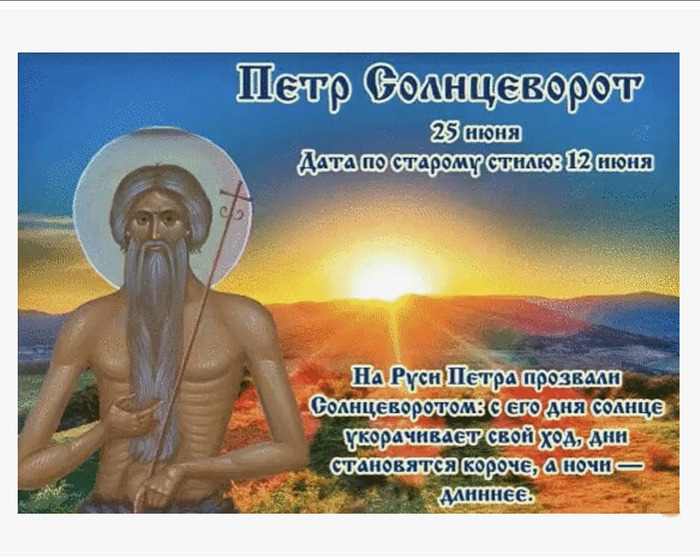 ТЕЛЕГРАММ замедляется.Вероятно скоро его заблокируют.Чтобы не потерять нас и получать оперативно информаци. подпишись на наши каналы в МАХ.Кто еще не подписался В полностью Российской сети МАХ на каналы ВОЕННЫЕ ПЕНСИОНЕРЫ ЗА РОССИЮ И ЕЕ ВООРУЖЕННЫЕ СИЛЫ: Канал для Военных пенсионерах без войны и политики, Военных пенсиях,пенсиях жен военных пенсионеров ,жизни военных пенсионеров и о способах прожить дольше : https://max.ru/voennyepen За Родину .Мы победим.: Оперативная информация О Спецоперации ,политике на канале: https://max.ru/join/aXh9SdoNhgk2rhy901ENolzCyoGLJhMgpon7E6np9n0 СРОЧНО ПОДПИСЫВАЙСЯ и ты будешь в курсе оперативных событий.НЕ пропусти!!! Дата в 2024 году: 25 июня , вторник Другие названия: Петр; Петров день; Петр-капустник; капустник; запоздалый капустник; Петр-рыболов; День Петра Афонского; Петр Афонский; День Петра Переворота; Петр-поворот Церковное название: Преподобного Петра Афонского Значение: День памяти преподобного Петра Афонского Традиции: Рыбалка; приготовление блюд из рыбы; высадка рассады капусты; посев зерновых Народный праздник Петр Солнцеворот отмечается 25 июня 2024 года (по старому стилю – 12 июня). По церковному календарю это дата почтения памяти преподобного Петра Афонского. Название праздника «Солнцеворот» связано с тем, что световой день в этот период укорачивается, а ночь увеличивается. Происходит это по причине поворота небесного светила на зиму, а лета – на жару. История Петр родился в Греции. Служил начальником императорского войска в Константинополе. Во время войны с сирийцами его схватили и удерживали в кандалах в крепости Аравийского города Самары, где он пробыл долгое время. В плену Петр переосмыслил свою жизнь и решил, что это Бог наказал его. Ведь долгое время он помышлял оставить мирскую жизнь и стать монахом, но все никак не решался на это. Когда он пришел к такому выводу, то стал поститься. Молился святому Николаю Чудотворцу и Симеону Богоприимцу, просил у них покровительства. Святые помогли ему покинуть темницу и дойти до границы Греции. По приходу в Рим сам Папа постриг его в монахи. Петр жил при нем до той поры, пока не познал все учение иноческой жизни. Однажды ему во сне явилась Богородица и указала Святую Гору Афон как место, где он должен провести всю оставшуюся жизнь. В 682 году Петр приплыл туда. Первое время он боролся с нападками бесов. 7 лет они осаждали его, оборачиваясь то воинами, то зверями. Однажды даже не побоялись предстать в облике ангелов. Но Петр знал, что только по велению Той, которая направила его сюда, он сможет двинуться с места. Однажды он встретил охотника, которому поведал историю своей жизни. Когда через год тот пришел к пещере отшельника с братом, одержимым демонами и другими людьми, оказалось, что Петр уже умер. Тогда опечаленный мужчина рассказал своим спутникам о жизни преподобного, а его брат исцелился в ту же секунду, как только коснулся тела святого. Произошло это в 734 году. Традиции и обряды В этот день люди ходят на рыбалку, готовят уху и другие блюда из рыбы. Петр Солнцеворот – конечный срок высадки рассады капусты и посева семян. Принято до обеда сеять зерна светлого цвета (например, овес, пшеницу), а после – темного (гречиху). Приметы Какая погода с утра до ночи, такая будет и в пору сенокоса. Вечером туман и много росы – хорошая погода продлится долго. Во время дождя тучи белые – может пойти град. О
