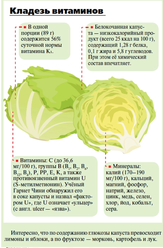 Продовольственная и сельскохозяйственная организация ООН признала капусту важнейшим источником продовольствия, включив её в двадцатку лучших овощных культур. Белокочанная капуста настолько привычный гость на наших столах, что её уникальные свойства часто недооценивают. Между тем этот овощ, который древние называли «лекарством для бедных», по праву входит в число самых полезных продуктов. Богатая история Белокочанная капуста (лат. Brassica oleracea var. capitata f. alba) — растение с богатой историей. Её дикие предки произрастали в Средиземноморье, Северной Африке и Западной Европе. Первыми окультурили капусту ещё за 3 тысячи лет до нашей эры индусы, затем древние египтяне (XV–X вв. до н. э.), а греки знали её уже в IV веке до нашей эры. В Древнем Риме капуста стала одной из самых востребованных овощных культур. Плиний Старший описывал семь её видов, а кочаны привычной нам круглой формы начали выращивать в Англии только в XIV веке. На Руси капусту сажали с IX века. Позже наша страна стала для неё «второй родиной» — русских огородников считали мастерами её выращивания. В 1998 году Продовольственная и сельскохозяйственная организация ООН признала капусту важнейшим источником продовольствия, включив её в двадцатку лучших овощных культур. Варианты использования Капуста универсальна: её едят сырой в салатах, квасят, мочат, тушат, варят, запекают. Классические русские щи, голубцы, бигус, пирожки с капустой — лишь малая часть кулинарного наследия. Особое место занимает квашеная капуста, которая долгое время спасала моряков от цинги. Для детей до 3 лет капусту рекомендуется давать только после термической обработки (варка, тушение, приготовление на пару), чтобы избежать излишнего газообразования. Также эта тактика подойдёт людям, употребляющим мало клетчатки. Начинаем с малого. Польза Терапевтический потенциал капусты был известен задолго до открытия витаминов. Древние египтяне, греки и римляне использовали её сок как слабительное, противоядие и средство от похмелья. Сегодня доказаны многие полезные свойства. Желудочно-кишечный тракт. Витамин U (S-метилметионин) ускоряет заживление язвы желудка и двенадцатиперстной кишки, уменьшает воспаление при гастритах и колитах, стимулирует выработку защитной слизи. Свежий капустный сок дополнительно обладает бактерицидным и фунгицидным действием. Сердечно-сосудистая система. Калий выводит излишки жидкости и нормализует давление, а пектины и клетчатка связывают и выводят холестерин, снижая риск атеросклероза. Обмен веществ и вес. Тартроновая кислота препятствует отложению жира, а низкая калорийность и обилие клетчатки делают капусту идеальным продуктом для использования во время снижения или поддержания веса. Кроветворение и свёртываемость. Витамин К₁ играет ключевую роль в процессе свёртывания крови, а фолиевая кислота, содержащаяся в наружных зелёных листьях, необходима для нормального кроветворения. Капуста — культура дисциплины. Она не терпит спешки, случайного грунта, затенения и «авось пронесёт». Царица овощей. Агроном советует, как лучше выращивать капусту Противопоказания Несмотря на пользу, белокочанная капуста имеет ряд противопоказаний. Заболевания ЖКТ в стадии обострения: гастрит с повышенной кислотностью, язвенная болезнь, энтерит, колит, панкреатит. Грубые пищевые волокна могут разд