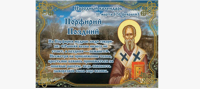 Дата в 2026 году: 11 марта , среда Другие названия: Порфирий; День Порфирия; Порфирий Поздняк; Птичий день Церковное название: Святителя Порфирия, архиепископа Газского Значение: Почтение памяти святого Порфирия Традиции: Домашние хлопоты; установка кормушек для птиц Народный праздник Порфирий Поздний отмечается 11 марта 2026 года (по старому стилю – 26 февраля). В церковном календаре это дата почтения памяти святого Порфирия Газского, архиепископа. Название «Поздний» связано с переменчивой погодой. Хотя весна приближается, доверять раннему теплу нельзя, так как за оттепелью обязательно ударят морозы. История Святитель Порфирий родился в 346 году в Фесалонниках. Благодаря состоятельности родителей получил хорошее образование. В 25 лет покинул дом и отправился в Египет. На Нитрийской горе познакомился со святым Иеронимом и вместе с ним пошел в Иерусалим, чтобы поклониться Животворящему Кресту Господню. Долгое время Порфирий жил в Иорданской пустыне. Все время он проводил в молитвах. Тяжелая болезнь заставила его вновь отправиться в Иерусалим. Он получил исцеление после того, как во сне ему явился сам Иисус Христос. Вскоре Порфирий познакомился с патриархом Иерусалимским, получил сан священника и был назначен хранителем честного Животворящего Креста Господня. В конце IV столетия его назначили епископом города Газы (Палестина). Большинство местных горожан были язычниками, которые во всем ущемляли христиан. Чтобы изменить ситуацию, епископ поехал в Константинополь, где заручился поддержкой архиепископа Иоанна Златоуста и императрицы Евдоксии. Так началось становление истинной веры. За 25 лет Порфирий полностью изменил положение в городе. К его смерти Газа стала христианским городом, в котором произошло немало чудес. В 420 году святой Порфирий скончался. Традиции и обряды Обычно в этот день солнце греет по-весеннему и обещает теплые дни. Но согласно поверью, ранней весне верить не стоит. После 11 марта происходит резкое похолодание. Зная об этом, люди не спешат засевать открытый грунт. День проходит в обычных хозяйских хлопотах. На Порфирия Позднего не стоит знакомиться с девушками и женщинами. Считается, что в этот день в них может вселиться кикимора. Ее цель – заморочить голову мужчине, соблазнить, увести с собой и отобрать силы. После такой встречи можно лишиться жизни. Любители птиц устанавливают на деревьях домики и кормушки. Приметы С утра туман стоит – жди непогоды. Если он опустился вечером – к погожему утру. Если внезапно пошел снег, значит, будет много осадков в летний период. Разгулявшаяся вьюга обещает дождливое и прохладное лето. Сошел снег – скоро будут заморозки. Если ночью небо безоблачное с яркими звездами, то летом будет много гроз. Голуби воркуют – к теплу. Птичьи гнезда больше расположены с солнечной стороны – лето будет холодным. Перелетные птицы вернулись – к богатому урожаю хлеба. 11 марта вербу сажать – смерть к себе звать. Нельзя брать веревку в руки на Порфирия Позднего, иначе в роду будет самоубийство. | |