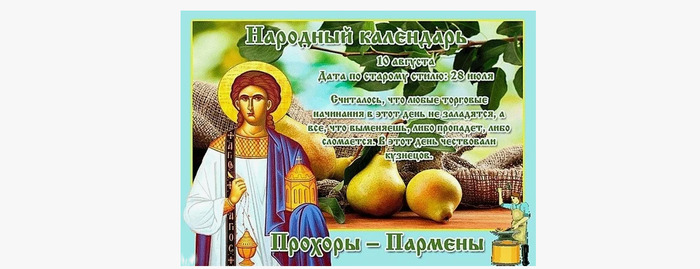 ТЕЛЕГРАММ замедляется.Вероятно скоро его заблокируют.Чтобы не потерять нас и получать оперативно информаци. подпишись на наши каналы в МАХ.Кто еще не подписался В полностью Российской сети МАХ на каналы ВОЕННЫЕ ПЕНСИОНЕРЫ ЗА РОССИЮ И ЕЕ ВООРУЖЕННЫЕ СИЛЫ: Канал для Военных пенсионерах без войны и политики, Военных пенсиях,пенсиях жен военных пенсионеров ,жизни военных пенсионеров и о способах прожить дольше : https://max.ru/voennyepen За Родину .Мы победим.: Оперативная информация О Спецоперации ,политике на канале: https://max.ru/join/aXh9SdoNhgk2rhy901ENolzCyoGLJhMgpon7E6np9n0 СРОЧНО ПОДПИСЫВАЙСЯ и ты будешь в курсе оперативных событий.НЕ пропусти!!! В Телеграмм создана группа " Военные пенсионеры за Россию и ее ВС. Мы победим". У кого есть Телеграмм просим вступить в нее. Там много интересного, срочного, очень оперативная информация, а также чего нельзя помещать в ОДНОКЛАССНИКАХ и на сайте. Вступить можно по ссылке: Военные пенсионеры за Россию и ее ВС. Мы победим "https://t.me/voenpenszaRossiu" Очень большая просьба НЕ ОТПИСЫВАТЬСЯ ОТ КАНАЛА, Канал работает в тестовом режиме. Мы стараемся понять, что Вам будет интересно читать и как работать дальше. Пишите, что бы Вам хотелось читать в ТЕЛЕГРАММ. Хоть в любой теме на сайте, хоть в Телеграмм. Чтобы не раздражали уведомления их можно ОТКЛЮЧИТЬ. Кого раздражают уведомления в Телеграмм их можно отключить. Отключить уведомления можно нажав на надпись ОТКЛЮЧИТЬ УВЕДОМЛЕНИЯ внизу Дата в 2025 году: 10 августа , воскресенье Другие названия: День Прохора; Прохор; Прохоров день Церковное название: Апостолов от 70-ти Прохора, Никанора, Тимона и Пармена диаконов Значение: День памяти двух апостолов от 70-ти – Прохора и Пармена Традиции: Сбор урожая груш, картофеля; выкапывание луковиц тюльпанов Данный народный праздник посвящен двум апостолам от семидесяти – Прохору и Пармену. Он отмечается 10 августа 2025 года (по старому календарю – 28 июля). Как гласит поверье, двенадцать учеников Иисуса созвали всех своих последователей (70 человек) и поручили им выбрать среди всех их семерых с целью возложения на них задач по решению повседневных и бытовых проблем для того, чтобы у самих апостолов было больше времени на несение слова Божия людям. Так, наравне с пятью другими, судьба улыбнулась и Прохору с Парменом. Прохор был учеником апостола Петра. В дальнейшем стал епископом Никомидии. Пострадал за свою веру в провинции Римской империи Антиохии. Дальнейшая судьба Пармена окутана тайной. Есть мнение, что он рассказывал о Евангелии в Македонии, где и окончил свою жизнь в 117 году. Также существует версия, по которой Пармен умер еще до отбытия апостолов из Иерусалима. Традиции и обряды На Прохора – Пармена собирают первый урожай спелых груш. Выкапывают луковицы тюльпана. В разгаре уборка картофеля. Также 10 августа отмечают свой праздник кузнецы. Их особо чтят крестьяне и стараются выразить свое уважение. Ведь кто, как не кузнец, и серп починит, и косу отладит, и коня подкует. Также им зачастую приписывали чародейские способности – ведь они понимают язык огня и металла. Приметы На Руси существовало поверье: «На Прохора и Пармена не будет толку от мены». В этот день старались ничего не менять, так как считалось, что оно или потеряется, или сломается. Щедрая роса поутру предвещает солнечный день. Если в этот день безветренно и льет дождь – это к продолжительной непогоде. Вы