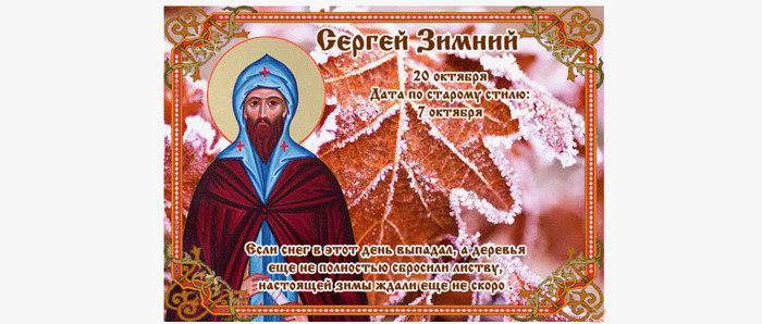 ТЕЛЕГРАММ замедляется.Вероятно скоро его заблокируют.Чтобы не потерять нас и получать оперативно информаци. подпишись на наши каналы в МАХ.Кто еще не подписался В полностью Российской сети МАХ на каналы ВОЕННЫЕ ПЕНСИОНЕРЫ ЗА РОССИЮ И ЕЕ ВООРУЖЕННЫЕ СИЛЫ: Канал для Военных пенсионерах без войны и политики, Военных пенсиях,пенсиях жен военных пенсионеров ,жизни военных пенсионеров и о способах прожить дольше : https://max.ru/voennyepen За Родину .Мы победим.: Оперативная информация О Спецоперации ,политике на канале: https://max.ru/join/aXh9SdoNhgk2rhy901ENolzCyoGLJhMgpon7E6np9n0 СРОЧНО ПОДПИСЫВАЙСЯ и ты будешь в курсе оперативных событий.НЕ пропусти!!! В Телеграмм создана группа " Военные пенсионеры за Россию и ее ВС. Мы победим". У кого есть Телеграмм просим вступить в нее. Там много интересного, срочного, очень оперативная информация, а также чего нельзя помещать в ОДНОКЛАССНИКАХ и на сайте. Вступить можно по ссылке: Военные пенсионеры за Россию и ее ВС. Мы победим "https://t.me/voenpenszaRossiu" Очень большая просьба НЕ ОТПИСЫВАТЬСЯ ОТ КАНАЛА,Необходимо нам 1000 подписчиков,чтобы нормально работать. Канал до этого времени будет работать в тестовом режиме. Мы стараемся понять, что Вам будет интересно читать и как работать дальше. Пишите, что бы Вам хотелось читать в ТЕЛЕГРАМ. Хоть в любой теме на сайте, хоть в Телеграмм. Чтобы не раздражали уведомления их можно ОТКЛЮЧИТЬ. Кого раздражают уведомления в Телеграм их можно отключить. Отключить уведомления можно нажав на надпись ОТКЛЮЧИТЬ УВЕДОМЛЕНИЯ внизу Дата в 2025 году: 20 октября , понедельник Другие названия: Сергий (Сергей), Сергий-начальник, Зиме начальник, Зазимки, Святоборы, Вакха Церковное название: Преподобного Сергия Послушливого, Печерского; Преподобного Сергия Нуромского (Вологодского); Мучеников Сергия и Вакха Значение: Почтение памяти трех святых Сергиев и мученика Вакха Традиции: Садятся за завтрак только после кормления домашней живности; замужние женщины одевают новые платки 20 октября 2025 года (7 октября по старому стилю) отмечается народный праздник Сергий Зимний. В церковном календаре – это дата почитания двух преподобных Сергиев (Печерского, Нуромского) и двух мучеников (Сергия и Вакха). Жили они в разные века, но зимняя погода определялась именно по дню их памяти. Преподобный Сергий Печерский проживал в XIII веке. Он был прозван Послушным по причине отречения от собственной воли, исполняя во всем волю наставника. Преподобный Сергий Нуромский жил в XV веке и был выходцем из греков. Став учеников С. Радонежского, он получил благословение и отправился к реке Нурма. Там стал жить в уединении и молитвах. Он подвергся множеству соблазнов, нападений разбойников, но везде его оберегала молитва. Узнав о месте обитания преподобного, к нему начали приходить паломники, и вскоре там была создана Нуромская обитель. После его смерти, спустя несколько десятков лет, христианину Никифору пришло явление, в котором было указано на необходимость расчищения места, где был упокоен святой. Не поверив в сон, он не стал это исполнять, и его разбил паралич. Добравшись до гроба Сергия Нуромского, Никифор получил исцеление. Он расчистил и облагородил место. С тех пор многие исцеления происходили именно здесь. Мученики Сергий и Вакх были военачальниками при императоре Максимиане (III-IV вв.). Они приняли мученическую смерть за веру в Христа. Традиции и обр