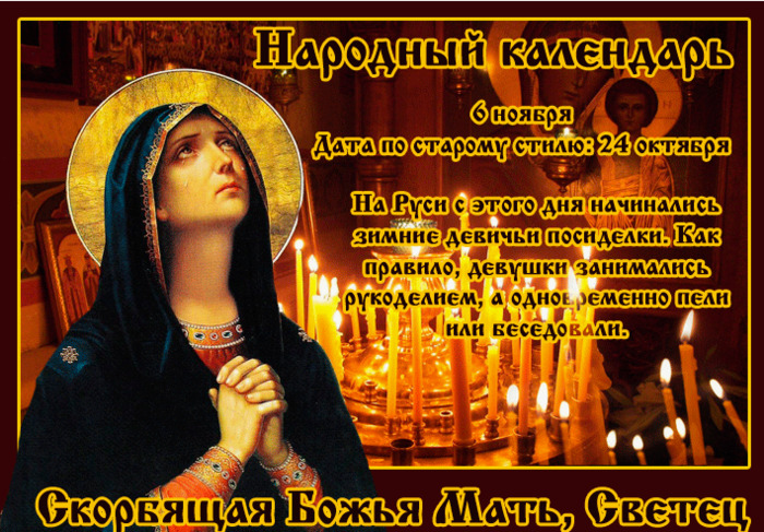 ТЕЛЕГРАММ замедляется.Вероятно скоро его заблокируют.Чтобы не потерять нас и получать оперативно информаци. подпишись на наши каналы в МАХ.Кто еще не подписался В полностью Российской сети МАХ на каналы ВОЕННЫЕ ПЕНСИОНЕРЫ ЗА РОССИЮ И ЕЕ ВООРУЖЕННЫЕ СИЛЫ: Канал для Военных пенсионерах без войны и политики, Военных пенсиях,пенсиях жен военных пенсионеров ,жизни военных пенсионеров и о способах прожить дольше : https://max.ru/voennyepen За Родину .Мы победим.: Оперативная информация О Спецоперации ,политике на канале: https://max.ru/join/aXh9SdoNhgk2rhy901ENolzCyoGLJhMgpon7E6np9n0 СРОЧНО ПОДПИСЫВАЙСЯ и ты будешь в курсе оперативных событий.НЕ пропусти!!! Дата в 2023 году: 6 ноября , понедельник Другие названия: Русский светец Церковное название: Иконы Божией Матери «Всех скорбящих Радость» Значение: Почтение памяти чудотворной иконы Богородицы Традиции: Девичьи посиделки, включающие занятие рукоделием и песни с танцами и играми Народный праздник Скорбящая Божья Мать (Светец) отмечается 6 ноября 2023 года (24 октября – дата по старому стилю). В этот день верующие православной церкви почитают икону Богородицы «Всех скорбящих Радость». Название Светец праздник получил по причине девичьих посиделок, которые проходили под освещением лучин. История праздника В XVII веке икона Божией Матери «Всех скорбящих Радость» находилась на хранении в Преображенской церкви. В те времена в Москве жила сестра патриарха Иоакима Евфимия. Она страдала от болезни, которую никто не мог излечить – раны в боку. В 1688 году, после молитвы Пресвятой Богородице, ей послышался голос, который возвестил о возможном исцелении у образа «Всех скорбящих Радость». Евфимия, призвав священника с этой иконой в свой дом и совершив над ней молебен, избавилась от недуга. В память о сотворении чуда и был создан данный праздник. Традиции и обряды Традиционно в этот день молодые незамужние девушки собирались на посиделки и занимались рукоделием. Местом сбора являлась изба либо дом вдовы или пожилой женщины, которой платили деньги за съем комнаты. Платой выступали продукты (в основном овощи) либо предложение о летней отработке в огороде или поле. Посиделки состояли из двух частей. Первая из них – это непосредственно дела по рукоделию. Вторая часть включала в себя веселье: песни, сопровождаемые танцами и играми. В условленное время в избу приходили молодые парни, которые выбирали невест и потом присылали в их дома сватов. Приметы Если в этот день услышать сверчка, то в дом придет несчастье. Если упасть в канаву, то жизнь будет долго длиться. Если зажженная лучина начала трещать – к морозу. Разбить зеркало в этот день – накликать на себя беду. Если женщина, страдающая косоглазием, разобьет в доме тарелку, то в течение года в доме произойдет смерть. Если в этот день человека до дома (подъезда) довела белая собака, то его ждет хорошая жизнь и денежное благополучие.. Сайт существует только благодаря Вам ,посетители и пользователи сайта. Кто хочет помочь сайту добровольно, перечислите деньги в сумме от 1 рубля на карту 4006800071005382 . Любая помощь в любом объеме поможет сайту выжить. Для перевода воспользуйтесь услугой Вашего банка онлайн через приложение или сходите в банк. Спасибо всем кто помогает сайту выжить !!! | |