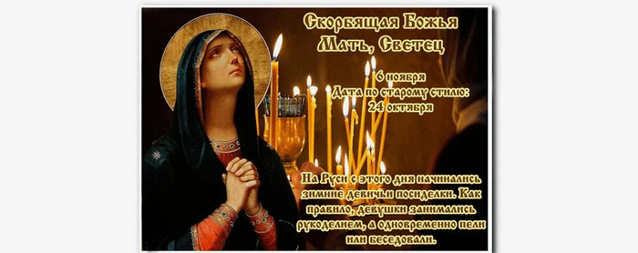 ТЕЛЕГРАММ замедляется.Вероятно скоро его заблокируют.Чтобы не потерять нас и получать оперативно информаци. подпишись на наши каналы в МАХ.Кто еще не подписался В полностью Российской сети МАХ на каналы ВОЕННЫЕ ПЕНСИОНЕРЫ ЗА РОССИЮ И ЕЕ ВООРУЖЕННЫЕ СИЛЫ: Канал для Военных пенсионерах без войны и политики, Военных пенсиях,пенсиях жен военных пенсионеров ,жизни военных пенсионеров и о способах прожить дольше : https://max.ru/voennyepen За Родину .Мы победим.: Оперативная информация О Спецоперации ,политике на канале: https://max.ru/join/aXh9SdoNhgk2rhy901ENolzCyoGLJhMgpon7E6np9n0 СРОЧНО ПОДПИСЫВАЙСЯ и ты будешь в курсе оперативных событий.НЕ пропусти!!! Дата в 2024 году: 6 ноября , среда Другие названия: Русский светец Церковное название: Иконы Божией Матери «Всех скорбящих Радость» Значение: Почтение памяти чудотворной иконы Богородицы Традиции: Девичьи посиделки, включающие занятие рукоделием и песни с танцами и играми Народный праздник Скорбящая Божья Мать (Светец) отмечается 6 ноября 2024 года (24 октября – дата по старому стилю). В этот день верующие православной церкви почитают икону Богородицы «Всех скорбящих Радость». Название Светец праздник получил по причине девичьих посиделок, которые проходили под освещением лучин. Содержание статьи История праздника В XVII веке икона Божией Матери «Всех скорбящих Радость» находилась на хранении в Преображенской церкви. В те времена в Москве жила сестра патриарха Иоакима Евфимия. Она страдала от болезни, которую никто не мог излечить – раны в боку. В 1688 году, после молитвы Пресвятой Богородице, ей послышался голос, который возвестил о возможном исцелении у образа «Всех скорбящих Радость». Евфимия, призвав священника с этой иконой в свой дом и совершив над ней молебен, избавилась от недуга. В память о сотворении чуда и был создан данный праздник. Традиции и обряды Традиционно в этот день молодые незамужние девушки собирались на посиделки и занимались рукоделием. Местом сбора являлась изба либо дом вдовы или пожилой женщины, которой платили деньги за съем комнаты. Платой выступали продукты (в основном овощи) либо предложение о летней отработке в огороде или поле. Посиделки состояли из двух частей. Первая из них – это непосредственно дела по рукоделию. Вторая часть включала в себя веселье: песни, сопровождаемые танцами и играми. В условленное время в избу приходили молодые парни, которые выбирали невест и потом присылали в их дома сватов. Приметы Если в этот день услышать сверчка, то в дом придет несчастье. Если упасть в канаву, то жизнь будет долго длиться. Если зажженная лучина начала трещать – к морозу. Разбить зеркало в этот день – накликать на себя беду. Если женщина, страдающая косоглазием, разобьет в доме тарелку, то в течение года в доме произойдет смерть. Если в этот день человека до дома (подъезда) довела белая собака, то его ждет хорошая жизнь и денежное благополучие. | |