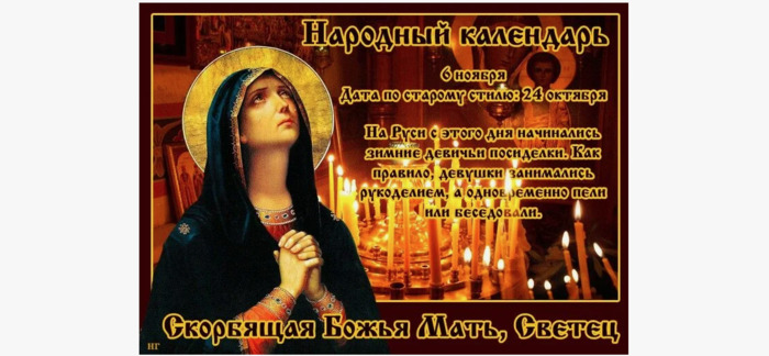 ТЕЛЕГРАММ замедляется.Вероятно скоро его заблокируют.Чтобы не потерять нас и получать оперативно информаци. подпишись на наши каналы в МАХ.Кто еще не подписался В полностью Российской сети МАХ на каналы ВОЕННЫЕ ПЕНСИОНЕРЫ ЗА РОССИЮ И ЕЕ ВООРУЖЕННЫЕ СИЛЫ: Канал для Военных пенсионерах без войны и политики, Военных пенсиях,пенсиях жен военных пенсионеров ,жизни военных пенсионеров и о способах прожить дольше : https://max.ru/voennyepen За Родину .Мы победим.: Оперативная информация О Спецоперации ,политике на канале: https://max.ru/join/aXh9SdoNhgk2rhy901ENolzCyoGLJhMgpon7E6np9n0 СРОЧНО ПОДПИСЫВАЙСЯ и ты будешь в курсе оперативных событий.НЕ пропусти!!! В Телеграмм создана группа " Военные пенсионеры за Россию и ее ВС. Мы победим". У кого есть Телеграмм просим вступить в нее. Там много интересного, срочного, очень оперативная информация, а также чего нельзя помещать в ОДНОКЛАССНИКАХ и на сайте. Вступить можно по ссылке: Военные пенсионеры за Россию и ее ВС. Мы победим "https://t.me/voenpenszaRossiu" Очень большая просьба НЕ ОТПИСЫВАТЬСЯ ОТ КАНАЛА, Необходимо нам 1000 подписчиков, чтобы нормально работать. Канал до этого времени будет работать в тестовом режиме. Мы стараемся понять, что Вам будет интересно читать и как работать дальше. Пишите, что бы Вам хотелось читать в ТЕЛЕГРАМ. Хоть в любой теме на сайте, хоть в Телеграмм. Чтобы не раздражали уведомления их можно ОТКЛЮЧИТЬ. Кого раздражают уведомления в Телеграм их можно отключить. Отключить уведомления можно нажав на надпись ОТКЛЮЧИТЬ УВЕДОМЛЕНИЯ внизу Дата в 2025 году: 6 ноября , четверг Другие названия: Русский светец Церковное название: Иконы Божией Матери «Всех скорбящих Радость» Значение: Почтение памяти чудотворной иконы Богородицы Традиции: Девичьи посиделки, включающие занятие рукоделием и песни с танцами и играми Народный праздник Скорбящая Божья Мать (Светец) отмечается 6 ноября 2025 года (24 октября – дата по старому стилю). В этот день верующие православной церкви почитают икону Богородицы «Всех скорбящих Радость». Название Светец праздник получил по причине девичьих посиделок, которые проходили под освещением лучин. История праздника В XVII веке икона Божией Матери «Всех скорбящих Радость» находилась на хранении в Преображенской церкви. В те времена в Москве жила сестра патриарха Иоакима Евфимия. Она страдала от болезни, которую никто не мог излечить – раны в боку. В 1688 году, после молитвы Пресвятой Богородице, ей послышался голос, который возвестил о возможном исцелении у образа «Всех скорбящих Радость». Евфимия, призвав священника с этой иконой в свой дом и совершив над ней молебен, избавилась от недуга. В память о сотворении чуда и был создан данный праздник. Традиции и обряды Традиционно в этот день молодые незамужние девушки собирались на посиделки и занимались рукоделием. Местом сбора являлась изба либо дом вдовы или пожилой женщины, которой платили деньги за съем комнаты. Платой выступали продукты (в основном овощи) либо предложение о летней отработке в огороде или поле. Посиделки состояли из двух частей. Первая из них – это непосредственно дела по рукоделию. Вторая часть включала в себя веселье: песни, сопровождаемые танцами и играми. В условленное время в избу приходили молодые парни, которые выбирали невест и потом присылали в их дома сватов. Приметы Если в этот день услышать сверчка, то в дом придет несчастье. Ес