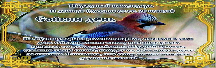 ТЕЛЕГРАММ замедляется.Вероятно скоро его заблокируют.Чтобы не потерять нас и получать оперативно информаци. подпишись на наши каналы в МАХ.Кто еще не подписался В полностью Российской сети МАХ на каналы ВОЕННЫЕ ПЕНСИОНЕРЫ ЗА РОССИЮ И ЕЕ ВООРУЖЕННЫЕ СИЛЫ: Канал для Военных пенсионерах без войны и политики, Военных пенсиях,пенсиях жен военных пенсионеров ,жизни военных пенсионеров и о способах прожить дольше : https://max.ru/voennyepen За Родину .Мы победим.: Оперативная информация О Спецоперации ,политике на канале: https://max.ru/join/aXh9SdoNhgk2rhy901ENolzCyoGLJhMgpon7E6np9n0 СРОЧНО ПОДПИСЫВАЙСЯ и ты будешь в курсе оперативных событий.НЕ пропусти!!! Дата в 2025 году: 11 декабря , четверг Другие названия: Птица-сойка; Сойка-вещунья; Иринархов день Церковное название: Мученика Иринарха Севастийского и святых семи жен Значение: Чествование сойки (птицы), день памяти святого Иринарха Традиции: Гадание на монетах Сойкин день отмечается 11 декабря 2025 года (28 ноября по старому стилю). В народе это праздник приветствия сойки. Это небольшая птица с ярким оперением, хохолком на голове и длинным хвостом. Самым интересным является тот факт, что она может подражать любому звуку, начиная от пения других птиц и заканчивая человеческой речью. Наблюдая за стойкостью и отвагой женщин, за тем, как они гордо клеймят позором мучителя, Иринарх понял, что хочет стать христианином. Он тут же заявил во всеуслышание о своем решении и признал Иисуса Христа истинным Богом. После этого принял мученическую смерть от руки собрата по ремеслу. Традиции и обряды В народе сойку называли «вещуньей». По ее крылышкам предсказывали свое будущее. Также в Сойкин день гадали на монетах. Для этого брали несколько штук и бросали в сугроб, а затем по одной доставали. Если первая найденная монетка оказывалась самой крупной из брошенных, то верили в то, что человеку обязательно улыбнется удача. Если же попадалась самая мелкая монета, то это говорило о том, что на успех в делах рассчитывать не стоит. Приметы Если сойка в этот день сядет на окно и начнет кричать – это хороший знак. Если последовать за встреченной сойкой, то она откроет дорогу к счастью. В колодце что-то позвякивает в Сойкин день – к богатству. | |