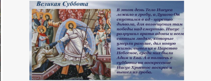 Дата в 2026 году: 11 апреля , суббота Другие названия: Красильная суббота; Суббота Страстной седмицы; Канун Пасхи Церковное название: Великая Суббота Значение: воспоминание о пребывании Иисуса Христа во гробе и о Его сошествии в ад Традиции: богослужения в храмах; схождение Благодатного огня в Иерусалиме; покраска яиц; приготовление пасхальных блюд Страстная, или Великая суббота – народно-христианский праздник. Это последний день перед Пасхой. В 2026 году Страстная суббота приходится на 11 апреля. Православная Церковь в этот день вспоминает погребение и пребывание Иисуса Христа во гробе и Его сошествие в ад. История праздника В первый день после распятия и погребения Христа, с самого утра, к прокуратору Пилату пришли первосвященники в сопровождении фарисеев. Они попросили поставить у гроба Иисуса стражу, чтобы ученики не похитили тело и не сказали, что Он воскрес. Понтий разрешил выставить охранников, а на камень, который закрывал скалу, наложить печать. Ученики положили тело Спасителя в новую пещеру в скале, где до того никого не хоронили. Стража подтвердила, что никто не мог ступить внутрь или выйти наружу. Это впоследствии послужило доказательством истинного чуда – воскресения Сына Божия. На второй день пребывания во гробе Иисус спустился в ад и сокрушил его врата. Он принес во тьму преисподней свет евангельской проповеди и возвестил о победе добра над злом. Спаситель опустошил ад, забрал с собой Адама, Еву, всех праведников и привел их в райскую обитель. Сошествием в ад Иисус завершил Свои искупительные мучения за человечество. Традиции и обряды праздника В этот день в храмах утром совершается литургия Василия Великого. Вечером читаются Деяния святых апостолов. Перед полуночью проводится Полунощница, во время которой священники уносят Плащаницу в алтарь и кладут на престол. В полночь начинается утреня. Церковные служители меняют темную одежду, в которой ходили с понедельника Страстной недели, на светлую. Вечером в церквях начинают освящать пасхальные куличи, крашеные яйца, вино, мясо и другие праздничные угощения. В Страстную субботу в Иерусалимском храме Воскресения происходит схождение Благодатного огня. В этот день хозяйки красят и украшают яйца, готовят пасхальные блюда. В этот праздник необходимо помириться с тем, с кем в ссоре, попросить прощения и простить обиду, покаяться и сознаться в своих грехах. Что можно кушать в Страстную субботу Страстная суббота приходится на последнюю неделю Великого поста. В этот день по церковному уставу разрешается сухоядение – невареная пища растительного происхождения: вода, хлеб, соль, сухофрукты, сырые овощи и фрукты, орехи, мед. Алкоголь принимать нельзя. Что нельзя делать в Страстную субботу Церковь запрещает в этот праздник убирать в доме, стирать, гладить, работать физически. Нельзя охотиться, рыбачить. Запрещается веселиться, петь, ругаться, ссориться. Следует воздержаться от секса. Нельзя отмечать день рождения, юбилей или свадьбу. Запрещается отдавать что-то из дома – так можно отдать здоровье, удачу и благополучие. Приметы на Страстную субботу Какая погода в этот день, таким и лето будет. Чтобы быть здоровым и красивым, нужно в воду для умывания положить свяченое яйцо. Бодрствование в ночь на Пасху ограждает от болезней, дарит богатый урожай, приносит удачу охотнику, а невес