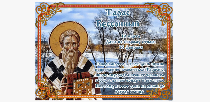 ТЕЛЕГРАММ замедляется.Вероятно скоро его заблокируют.Чтобы не потерять нас и получать оперативно информаци. подпишись на наши каналы в МАХ.Кто еще не подписался В полностью Российской сети МАХ на каналы ВОЕННЫЕ ПЕНСИОНЕРЫ ЗА РОССИЮ И ЕЕ ВООРУЖЕННЫЕ СИЛЫ: Канал для Военных пенсионерах без войны и политики, Военных пенсиях,пенсиях жен военных пенсионеров ,жизни военных пенсионеров и о способах прожить дольше : https://max.ru/voennyepen За Родину .Мы победим.: Оперативная информация О Спецоперации ,политике на канале: https://max.ru/join/aXh9SdoNhgk2rhy901ENolzCyoGLJhMgpon7E6np9n0 СРОЧНО ПОДПИСЫВАЙСЯ и ты будешь в курсе оперативных событий.НЕ пропусти!!! В Телеграмм создана группа " Военные пенсионеры за Россию и ее ВС. Мы победим". У кого есть Телеграмм просим вступить в нее. Там много интересного, срочного, очень оперативная информация, а также чего нельзя помещать в ОДНОКЛАССНИКАХ и на сайте. Вступить можно по ссылке: Военные пенсионеры за Россию и ее ВС. Мы победим "https://t.me/voenpenszaRossiu" Очень большая просьба НЕ ОТПИСЫВАТЬСЯ ОТ КАНАЛА, Канал работает в тестовом режиме. Мы стараемся понять, что Вам будет интересно читать и как работать дальше. Пишите, что бы Вам хотелось читать в ТЕЛЕГРАММ. Хоть в любой теме на сайте, хоть в Телеграмм. Чтобы не раздражали уведомления их можно ОТКЛЮЧИТЬ. Кого раздражают уведомления в Телеграмм их можно отключить. Отключить уведомления можно нажав на надпись ОТКЛЮЧИТЬ УВЕДОМЛЕНИЯ внизу Дата в 2025 году: 10 марта , понедельник Другие названия: Тарасий-кумошник; Тарас-трясучник; Вешняя дрема; Тарас; кумоха Церковное название: Святителя Тарасия, архиепископа Константинопольского Значение: Почтение памяти святого Тарасия Традиции: Молитвы святому Тарасию о защите от лихорадки Народный праздник Тарас Бессонный отмечается 10 марта 2025 года (по старому стилю – 25 февраля). В православном календаре это дата почтения памяти святителя Тарасия Константинопольского, архиепископа. Название праздника «Бессонный» пошло от того, что в этот день нельзя ложиться спать днем. Суеверия гласят, что так в организм проникает болезнь. Сперва она убаюкивает человека, а затем входит в спящего. Детям также не дают дремать до захода солнца. История Святитель Тарасий родился в конце VIII века в Константинополе. Родители дали ему хорошее образование. Благодарю этому он стал царским советником. Во времена религиозного движения, направленного против святых ликов христианства, патриарх Павел удалился в монастырь. На свой пост он назначил Тарасия, который в тот момент вел мирской образ жизни. В 784 году он прошел все монашеские ступени и вступил в должность патриарха. Спустя три года созвал Вселенский Собор в Нике для утверждения почитания христианских икон. Следующие 19 лет, до самой кончины, Тарасий управлял Церковью. Он отличался мудростью, аскетизмом и исключительной добротой. Большую часть времени уделял старикам, нищим, больным, сиротам и вдовам. Во время праздника Пасхи накрывал для них стол, за которым прислуживал сам. В 806 году епископ скончался. Традиции и обряды В этот день молятся святому Тарасию и просят у него защиты от лихорадки. Данная болезнь предками воспринималась как некое демоническое существо, которое живет в лесу со своими сестрами. Появление симптомов заболевания в зимне-весенний период сейчас легко объяснить переменчивостью погоды. Но предки верили, что ли